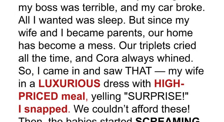 That was the worst night of my life. I’d closed from work. Money was tight, my boss was terrible, and my car broke. All I wanted was sleep. But since my wife and I became parents, our home has become a mess. Our triplets cried all the time, and Cora always whined. So, I came in and saw THAT — my wife in a LUXURIOUS dress with HIGH-PRICED meal, yelling “SURPRISE!” I snapped. We couldn’t afford these! Then, the babies started SCREAMING, and I made Cora go out and buy diapers. Finally, an HOUR later, there was a knock on the door. I opened it.