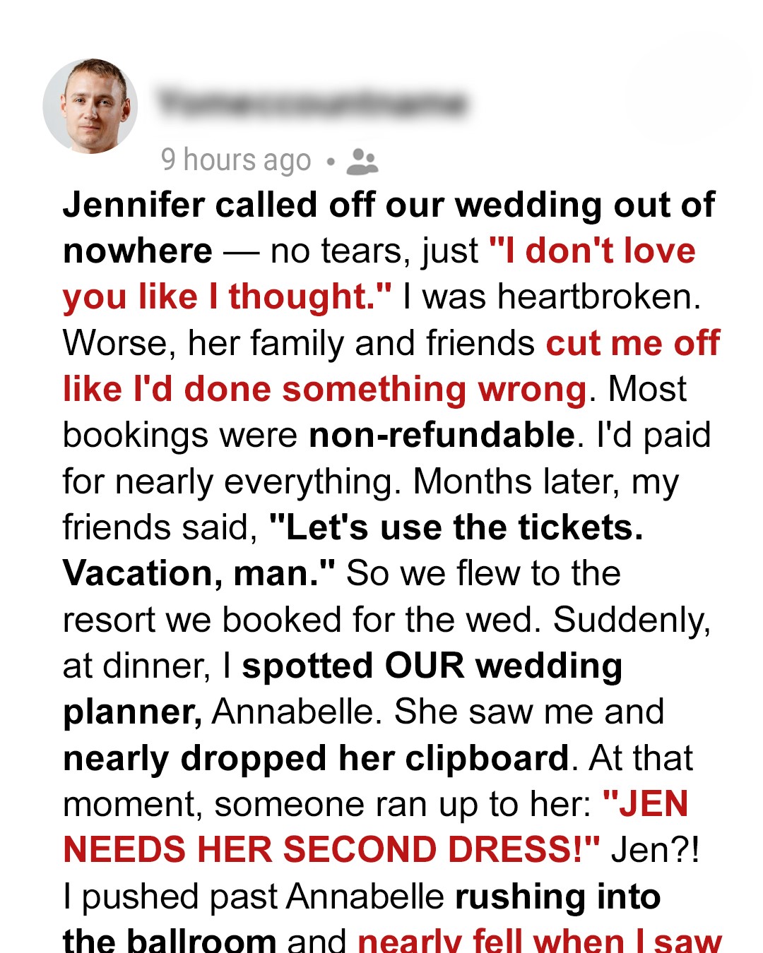 She called it off with three words: “I don’t love you like I thought.” No tears. No explanation. Just a blank stare, a coldness that froze my blood. Our wedding was two months away. Everything was booked, paid for. My life savings, gone. Just like that. I tried to talk, to beg, to understand, but she just shut me out. It was a brick wall. The heartbreak was physical. A constant ache behind my ribs, a hollow echo in my chest where my future with her used to be. But what really twisted the knife was how everyone reacted. Her family, her friends, even some people I’d known for years – they all vanished. They cut me off. Blocked my calls. Unfollowed. It was like I was the villain, like I had done something unforgivable. No one said why. They just disappeared, leaving me alone with a mountain of non-refundable receipts and a broken heart. I’d paid for nearly everything. Every vendor. Every deposit.