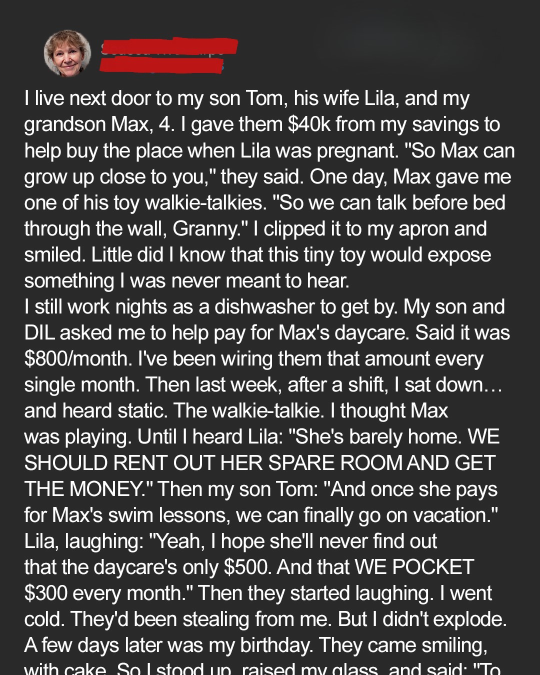 I heard it all. Every word. The crackle of the toy walkie-talkie, usually a comforting reminder of little Max, turned into a chilling conduit of betrayal. Lila’s voice, sharp and dismissive: “She’s barely home. WE SHOULD RENT OUT HER SPARE ROOM AND GET THE MONEY.” Then my son, Tom, my own flesh and blood, chimed in, calmly, discussing swim lessons and vacations. Lila, her laughter cold and calculated, exposing the daycare lie: “Yeah, I hope she’ll never find out that the daycare’s only $500. And that WE POCKET $300 EVERY MONTH.” I went cold. A deep, bone-aching chill that settled in my heart. They’d been stealing from me. For months. Every dollar I wired, every extra shift I worked as a dishwasher, thinking I was helping my grandson, his future. It was going into their pockets. Not for Max. For them. For their vacations. For their convenience. My sacrifices, a joke.