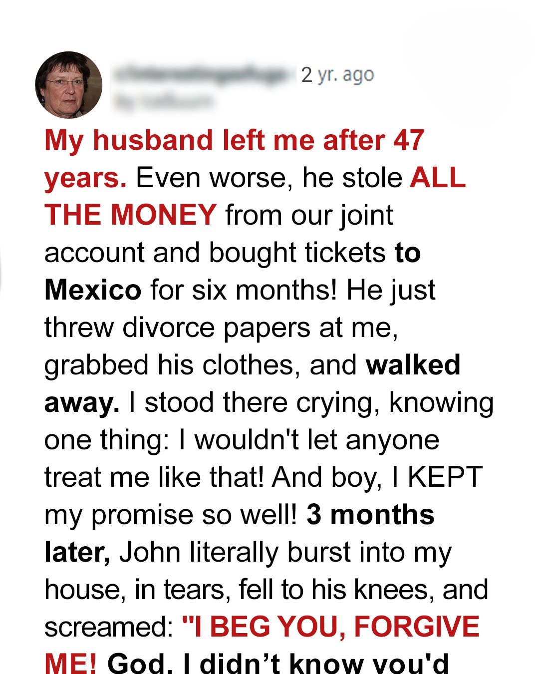Forty-seven years. Forty-seven years of my life, gone in a single, cruel breath. I still see the image, burned into my mind: the crisp, white envelope with the divorce papers fluttering to the floor, his packed suitcase by the door, and that cold, dead look in his eyes. No argument. No explanation. Just… nothing. He just turned, walked out, and closed the door. Leaving me standing in the silent hallway, the weight of nearly five decades crushing me. Then the bank statement arrived. EVERY PENNY. GONE. Our entire life savings. Our retirement. Every shared dream we’d ever mumbled about over coffee. ALL of it. And the confirmation on his credit card: tickets to Mexico. Six months. Six months! While I was left with nothing but a half-empty house and the bitter taste of betrayal coating my tongue. I was a fool. An old, used-up fool.