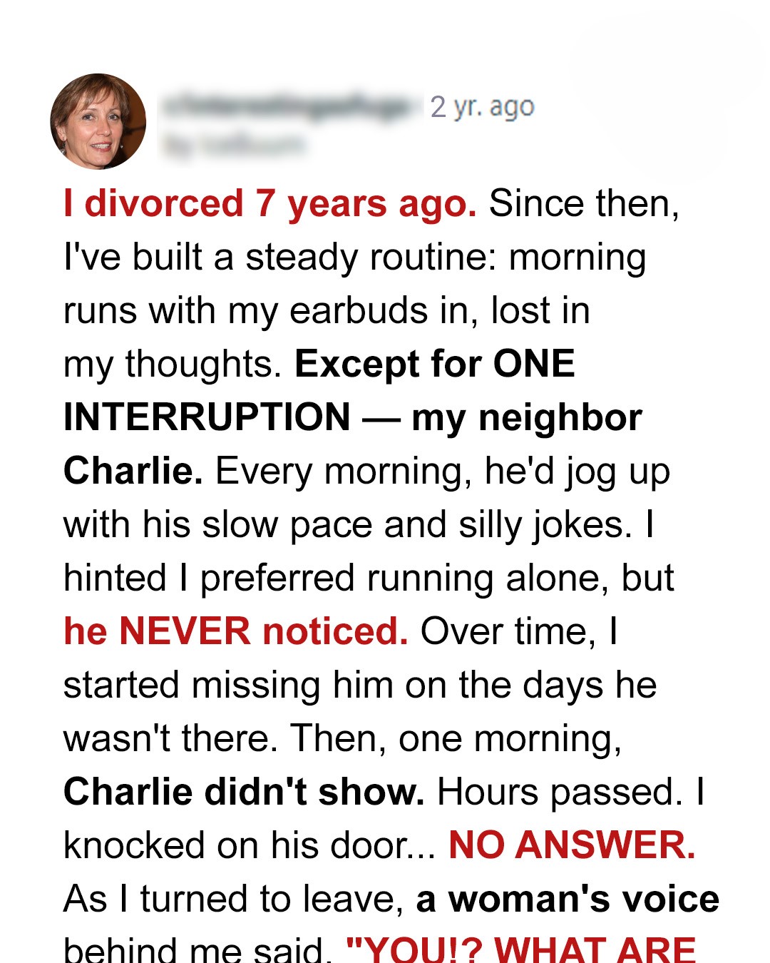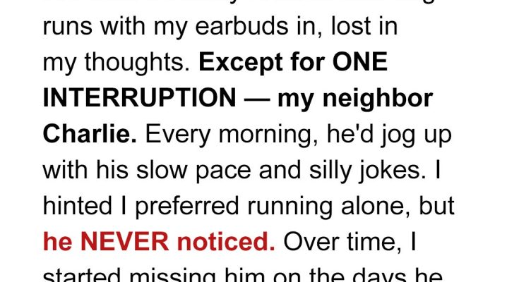 Seven years. Seven long years since my divorce ripped my life apart, leaving me with nothing but shattered trust and an empty house. My morning runs became my religion, my meditation, my only quiet solace. Earbuds in, world out, just the rhythmic pound of my feet on the pavement, lost in the echo chamber of my own thoughts. Except for ONE INTERRUPTED. Every single morning, without fail, my neighbor Charlie would jog up beside me. He had this slow, lumbering pace and a repertoire of truly awful, cheesy jokes. I hated it. I craved silence, anonymity, the chance to process the wreckage of my past without interruption. I hinted. Oh, did I hint. I’d pick up my pace, pretend not to hear him, even just grunt in response to his relentless cheerfulness. He NEVER noticed. Or maybe, he pretended not to notice. I just wanted him to leave me alone. I really did.
