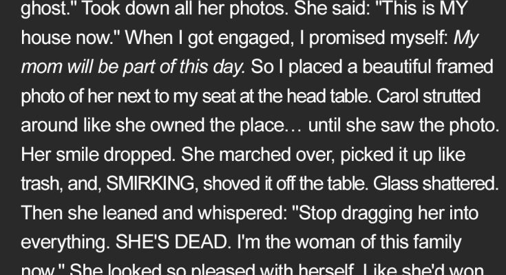 Then it started. One by one, the photos of my mom disappeared. First from the living room, then the hall, then even the small, precious ones from my dad’s study. When I asked where they went, Carol just smiled, a thin, knowing twist of her lips. She said: “This is MY house now.” She stood there, regal and cold, like she’d won some private war.