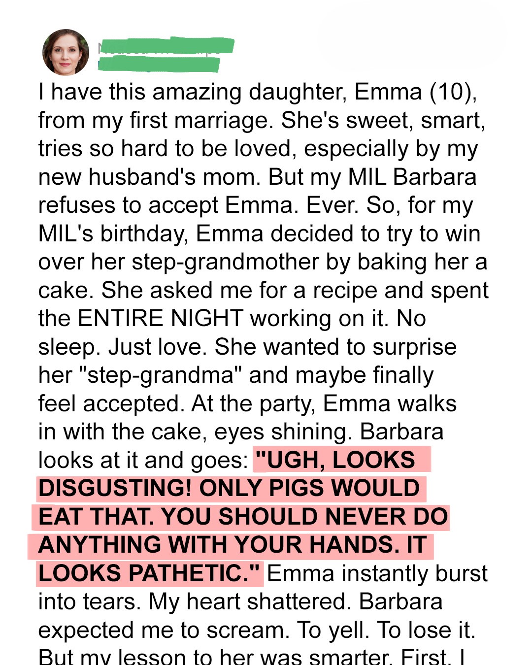 Her hatred, her venom, her relentless cruelty towards my innocent daughter… it wasn’t about a step-grandchild. It was about us. About what we did. About the secret she was forced to carry while watching me play the innocent victim. And in that moment, as my daughter stood there, sobbing over a ruined cake, I finally understood. My MIL wasn’t just being cruel to a child. She was showing me, in the most brutal way imaginable, exactly how she had felt for ten years. And the true, heartbreaking twist was that, for the first time, I couldn’t blame her. I couldn’t blame her at all.