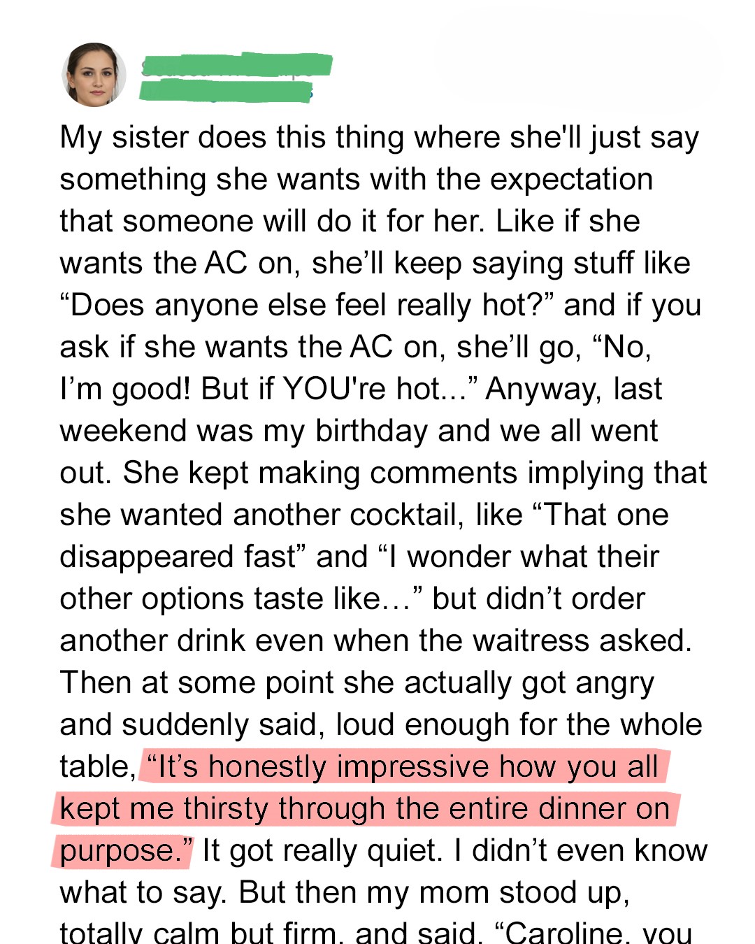 My sister does this thing where she’ll just say something she wants with the expectation that someone will do it for her. “Does anyone else feel really hot?” Or, “My stomach hurts, I wish I had ice cream…” Never a direct ask. If you offer, she’ll demur, oh no, I couldn’t possibly inconvenience you. It’s always been like that. Subtle. Manipulative. Infuriating. Last weekend was my birthday dinner with family. Predictably, Caroline made it about her. She kept making comments implying she wanted another cocktail: “That one disappeared fast,” or “I wonder what their other options taste like…” But she never ordered one, even when the waitress asked. I watched her, biting back my usual exasperated sigh. Just order the drink, for goodness sake. We tried to ignore it, focusing on my dad’s funny story, but the tension was a physical presence. Then she snapped. Slammed her hand on the table. Her voice, usually so sweet, was suddenly sharp, brittle. “It’s honestly impressive how you all kept me thirsty through the entire dinner on purpose.”