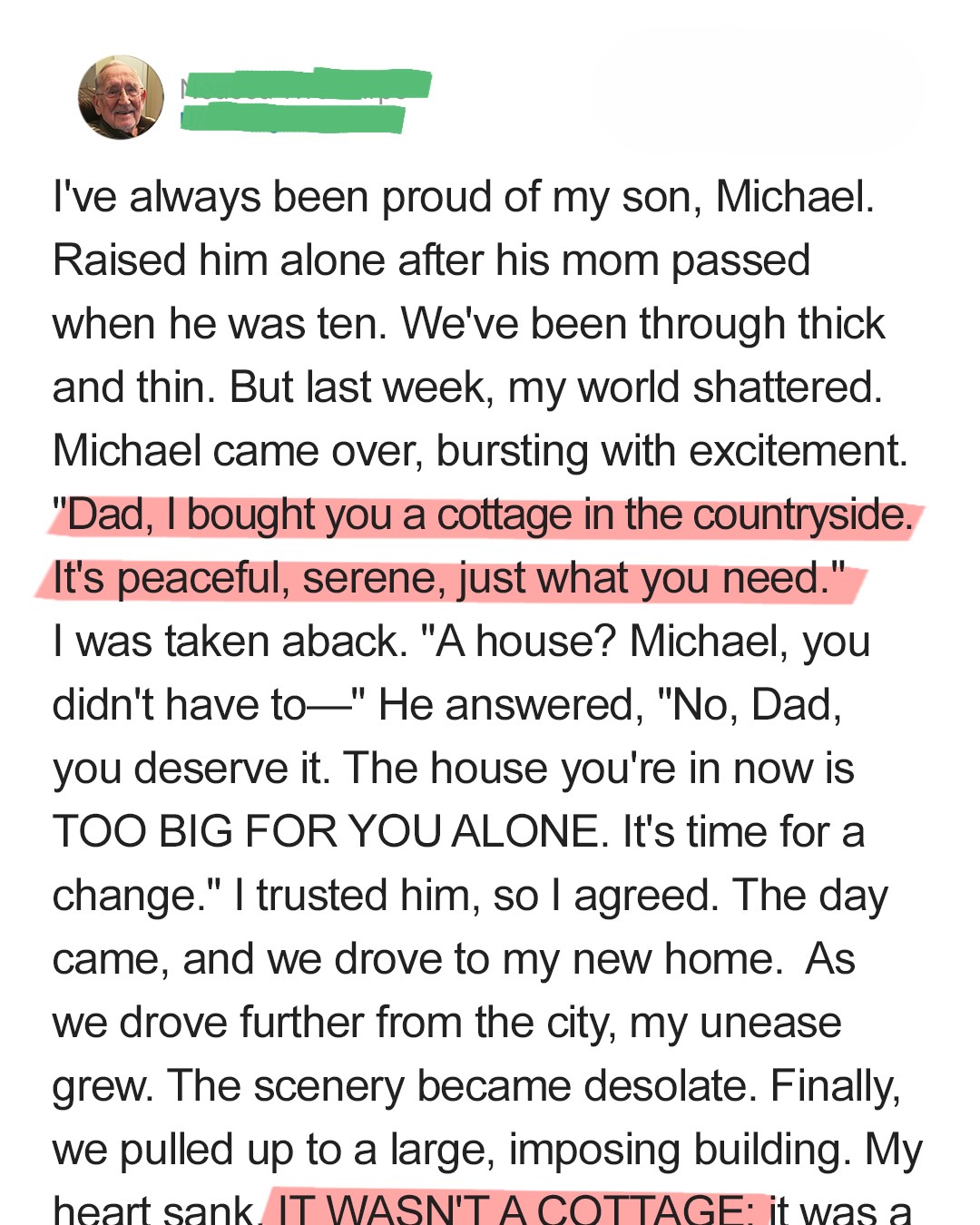 My heart sank. IT WASN’T A COTTAGE’ it was a gated complex, stark and modern, with high fences and perfectly manicured, yet strangely barren, grounds. A huge, imposing building that screamed institution, not idyll. I turned to him, my son, who was beaming, oblivious to the dread that had just taken root in my gut. “What is this, son?” My voice was thin, reedy. He clapped me on the shoulder, a gesture that usually brought comfort but now felt like a firm, paternal shove. “It’s perfect, Dad! Look at the facilities! Round-the-clock care, activities, healthy meals. You’ll never be lonely.” Lonely? I raised him alone after his mom passed when he was ten. We’d been through thick and thin. Every scraped knee, every heartbreak, every triumph. I taught him to ride a bike, helped him with his calculus, held him when he cried for his mother. I was there. ALWAYS. He was my world, my purpose. And I was his, or so I thought.