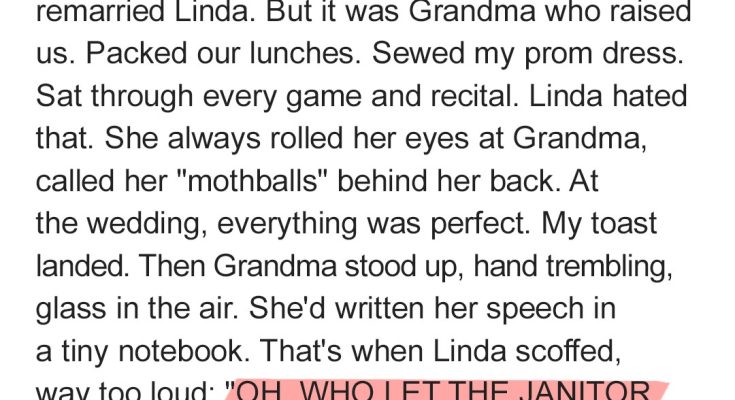 The air in the ballroom wasn’t just still; it was crystalline, brittle, ready to shatter. The clink of a fork on a plate, the soft hum of the air conditioning – every sound suddenly amplified, excruciating. Linda, my dad’s wife, sat there, a smirk playing on her lips, her eyes scanning the frozen faces. She loved being the center of attention, even when it was for something so utterly despicable. Grandma, dear, sweet Grandma, stood at the podium. Her hand, which had been holding her tiny, handwritten speech, was now slowly lowering the glass of champagne. Her eyes, usually sparkling with life and warmth, were wide, brimming with a hurt so profound it took my breath away. Her shoulders slumped. She looked like a child caught in a cruel joke she didn’t understand. Jacob’s jaw, which had been clenched during my own toast, now locked with an intensity I rarely saw. A vein pulsed in his temple. He didn’t even look at Linda. His gaze was fixed on Grandma, then slowly swept over the room, settling on my dad. Dad, who was slowly turning a ghastly shade of white, like all the blood had drained from his face. Linda, oblivious or uncaring, took another sip of her wine. “Honestly,” she mumbled, loud enough for those around her to hear, “some people just can’t take a joke.”