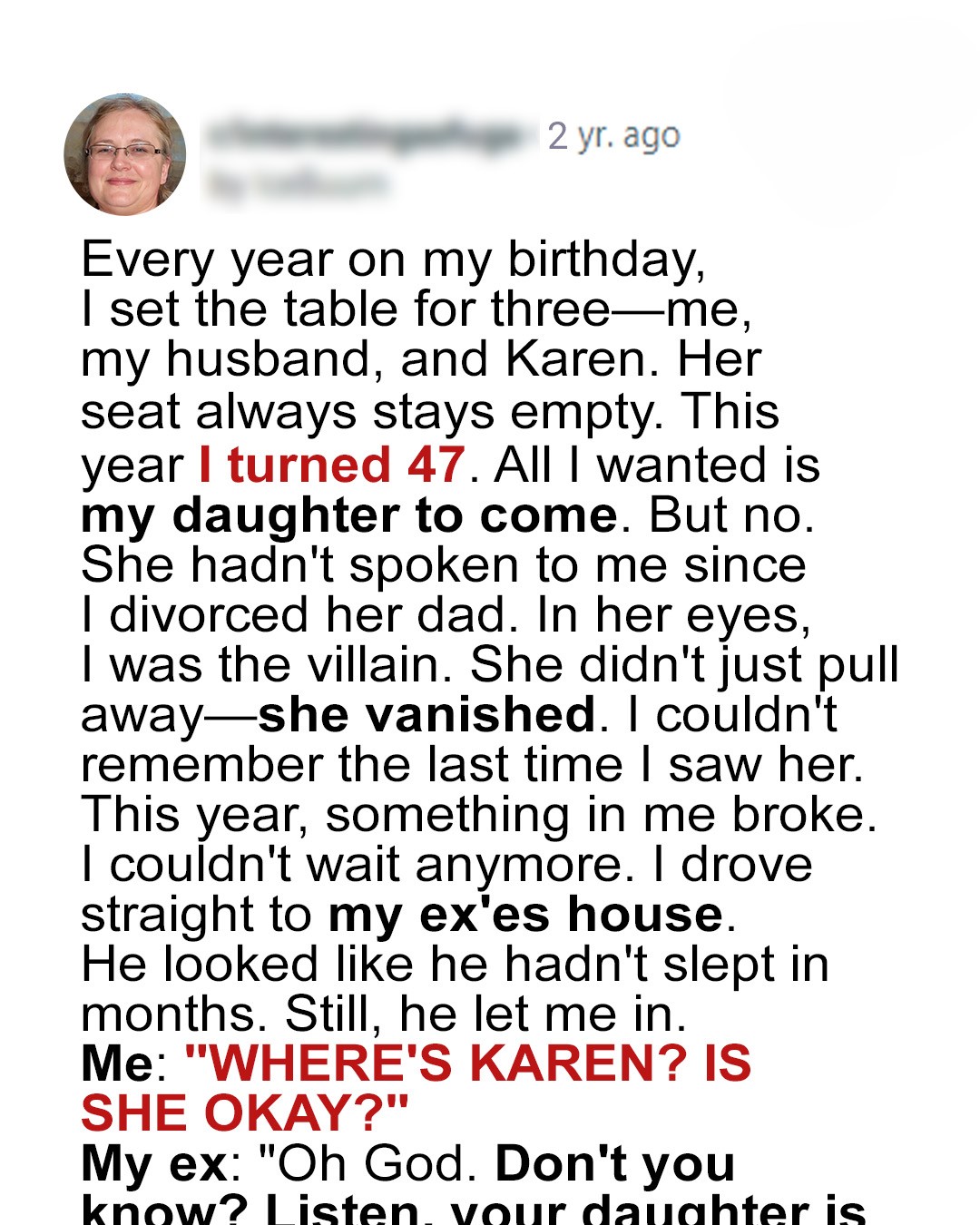 Every year on my birthday, it’s the same ritual. I set the table for three. Me. My husband. And Karen. Her seat always stays empty. A silent placeholder for a ghost from a life I destroyed. A constant, aching reminder. A penance, maybe. This year, I turned 47. Another year older, another year of that empty chair. But this time, the silence was deafening. All I wanted, all I truly ached for, was for my daughter to come. To just be there. But no. She hadn’t spoken to me since I divorced her dad. Not a call, not a text, not a single forwarded email. In her eyes, I wasn’t just wrong; I was the villain. The destroyer of her perfect world. She didn’t just pull away—she vanished. I couldn’t remember the last time I saw her face, heard her laugh, felt her arms around me. A black hole swallowed her, and every birthday it pulled harder. This year, something in me broke. The weight of all those empty years, all those unspoken words, the crushing guilt. I couldn’t wait anymore. I pushed the half-eaten cake away, the one my husband had lovingly bought, and felt a cold resolve harden inside me. I had to know. I had to find a piece of her, or Karen, or anyone who could tell me anything. I stood up, left the uneaten dinner, and grabbed my keys.