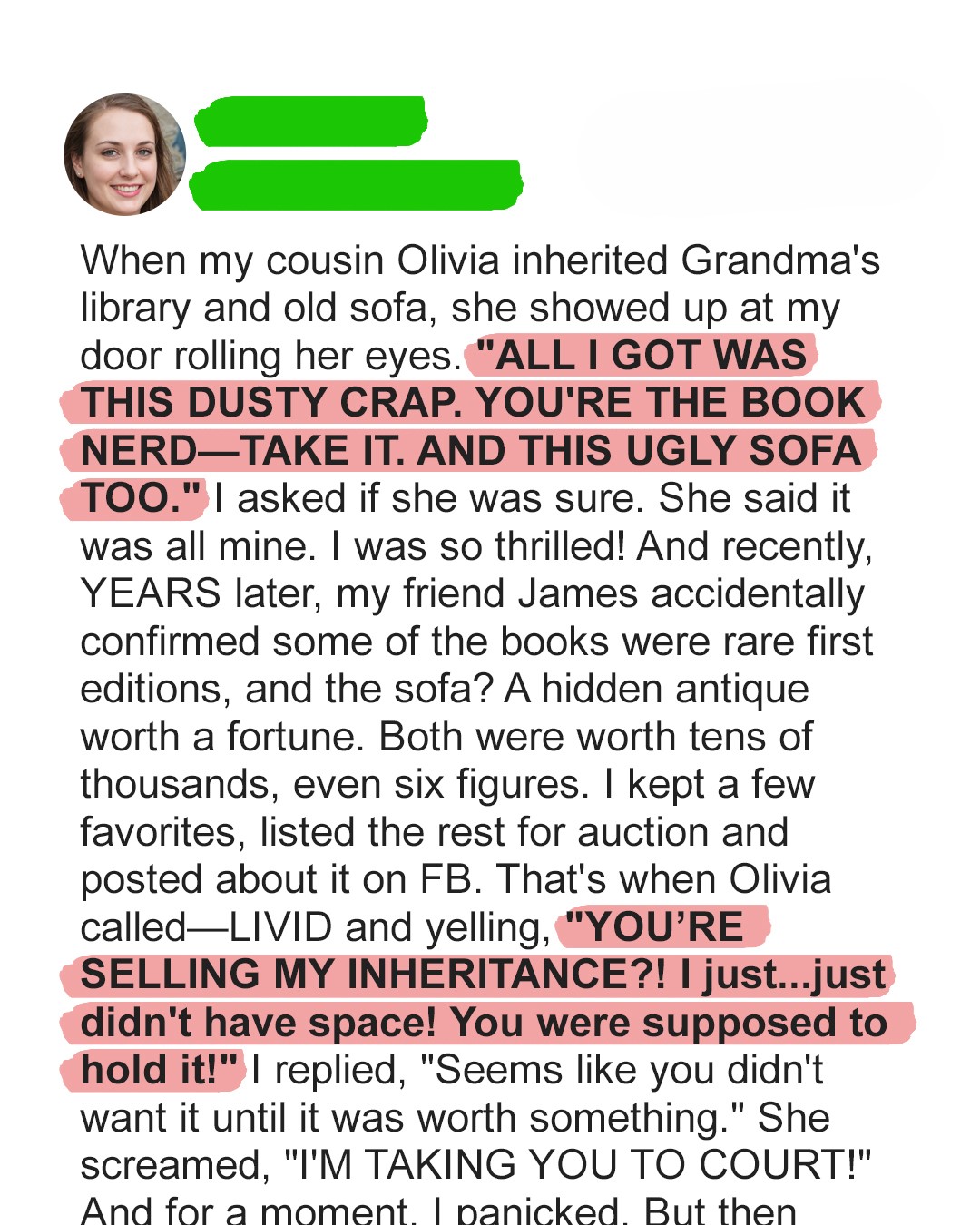 And now, as Olivia’s threats faded from my consciousness, replaced by Grandma’s quiet words, it hit me. Grandma knew. She knew Olivia wouldn’t appreciate the books, wouldn’t appreciate the sofa, wouldn’t see the history, the love, the real value. She knew Olivia would reject them.