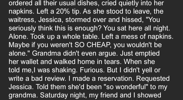 Last Wednesday should’ve been my grandparents’ 50th anniversary. But Grandpa passed away two years ago. It broke my Grandma, but she still celebrated. Alone. She went to their favorite restaurant, ordered all their usual dishes, cried quietly into her napkins. Left a 20% tip. As she stood to leave, the waitress, Jessica, stormed over and hissed, “You seriously think this is enough? You sat here all night. Alone. Took up a whole table. Left a mess of napkins. Maybe if you weren’t SO CHEAP, you wouldn’t be alone.” Grandma didn’t even argue. Just emptied her wallet and walked home in tears. When she told me, I was shaking. Furious. But I didn’t yell or write a bad review. I made a reservation. Requested Jessica. Told them she’d been “so wonderful” to my grandma. Saturday night, my friend and I showed up looking fancy. Ordered the most expensive wine. Appetizers. Desserts. Tipped Jessica after every pour. She was glowing with fake smiles, sugar-sweet compliments. Then, when the check came, I told Jessica, “You’ve been amazing. This is just a little thank you.” I pulled out a THICK envelope. Her eyes lit up. She thought it was full of cash.