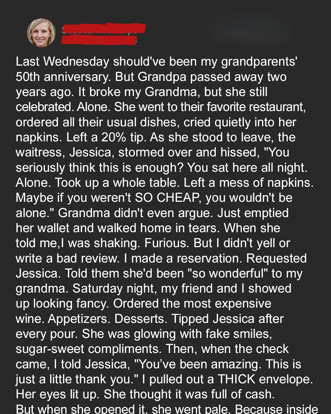Last Wednesday should’ve been my grandparents’ 50th anniversary. But Grandpa passed away two years ago. It broke my Grandma, but she still celebrated. Alone. She went to their favorite restaurant, ordered all their usual dishes, cried quietly into her napkins. Left a 20% tip. As she stood to leave, the waitress, Jessica, stormed over and hissed, “You seriously think this is enough? You sat here all night. Alone. Took up a whole table. Left a mess of napkins. Maybe if you weren’t SO CHEAP, you wouldn’t be alone.” Grandma didn’t even argue. Just emptied her wallet and walked home in tears. When she told me, I was shaking. Furious. But I didn’t yell or write a bad review. I made a reservation. Requested Jessica. Told them she’d been “so wonderful” to my grandma. Saturday night, my friend and I showed up looking fancy. Ordered the most expensive wine. Appetizers. Desserts. Tipped Jessica after every pour. She was glowing with fake smiles, sugar-sweet compliments. Then, when the check came, I told Jessica, “You’ve been amazing. This is just a little thank you.” I pulled out a THICK envelope. Her eyes lit up. She thought it was full of cash.