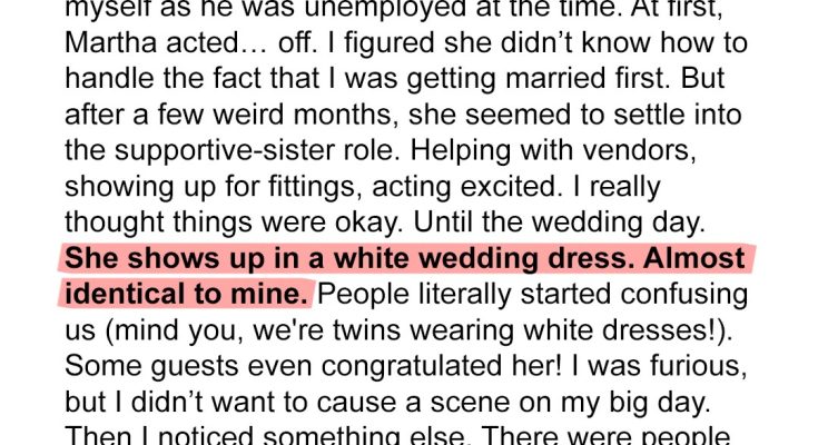 My breath hitched. My jaw went slack. She stood there, in the doorway, beaming. In a white wedding dress. Almost identical to mine. The same sweetheart neckline, the same flowing train. My stomach dropped. I stared, speechless. My bridesmaids gasped. My mother looked like she’d seen a ghost.
