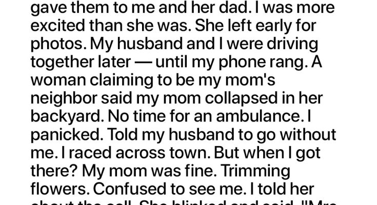 The world blurred. My mom. Collapsed. Alone. My mind screamed. “I have to go! I have to go to my mom!” I barely registered my husband’s concerned face. “You go. Go to the graduation. Don’t miss it for her. I’ll meet you there as soon as I can. Please, just go.” I shoved the keys into his hand. My own car was faster, more familiar. He looked hesitant, but I was already out the door, fumbling for my keys, panic a cold, hard knot in my stomach.