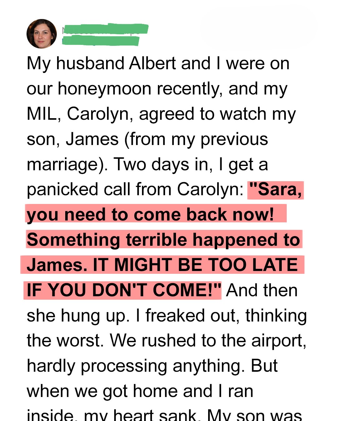My husband and I were two days into our dream honeymoon when the world shattered. We were finally alone, finally celebrating, finally breathing after months of planning, when my phone screamed. It was his mother, Carolyn, who was watching my son from my previous marriage. Just a quick check-in, I thought, a funny anecdote about James. Instead, her voice was a raw, choked sob. “Sara, you need to come back now! Something terrible happened to James. IT MIGHT BE TOO LATE IF YOU DON’T COME!” Then, silence. Just a dial tone. My heart didn’t just sink; it plunged into an abyss. I dropped the phone. James. My sweet boy. My world. Was he hurt? Was he gone? My mind conjured every nightmare scenario, each one more horrifying than the last. Albert, my new husband, rushed to my side, his face a mask of concern. He didn’t need me to explain. He saw the terror in my eyes, heard the frantic, desperate cries that tore from my throat.