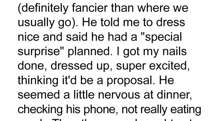 So yesterday was our 3-year anniversary. Three years. It felt like a lifetime and a heartbeat all at once. I’d been practically counting down the days, a nervous flutter in my stomach every time he mentioned it. He’d planned a dinner at a nicer restaurant, definitely fancier than where we usually go. He told me to dress nice and said he had a “special surprise” planned. A surprise. My mind latched onto those words, twisting them into one glorious possibility. A proposal. It had to be. We’d talked about our future, hinted at rings, and this was our big anniversary. It was the perfect moment. I spent hours getting ready. I got my nails done, picked out the dress he loved, did my hair just right. Every mirror I passed showed a woman bubbling with a secret, hopeful joy. I felt beautiful, radiant, completely ready to say yes. He was already there when I arrived, standing awkwardly by the hostess stand, scrolling on his phone. He looked good, but different. Dressed up, yes, but his usual easy smile was tight. He seemed… brittle. He kept checking his phone, even at the table. Not a quick glance, but a focused, almost desperate check. My stomach tightened, but I pushed it down. Nerves, I told myself. He’s just nervous about popping the question. It’s a big deal. I tried to make conversation, tried to lighten the mood, but his answers were short, distracted. He barely touched his food.