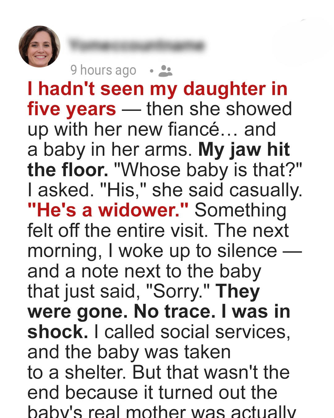 My own daughter. Not the widower’s child. Not a stepchild. MY GRANDCHILD. A child she had conceived, birthed, and then abandoned on my doorstep, fabricating an elaborate lie to cover her tracks. The “Sorry” note wasn’t an apology for leaving, it was an apology for the truth. For leaving her own child. The quiet fiancé, the distant demeanor, the clinical stories — it all clicked into place, a monstrous puzzle. All this time, I had a grandchild I didn’t know about.