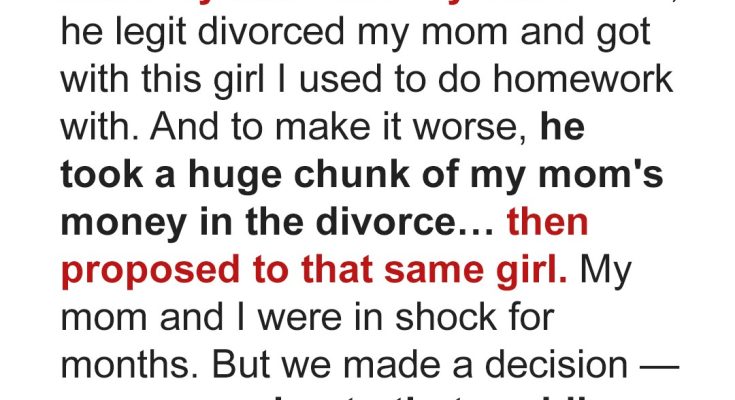 My dad had divorced my mom, not because he found a younger lover, but because he was dying. He pushed her away, ripped her heart out, so she wouldn’t have to watch him waste away. And the “huge chunk of her money” he took? My friend explained, her voice barely audible, tears streaming down her face. “He set up a trust for her. For you. All of it. He just… didn’t want her to know it was from him. He wanted her to think she’d lost everything, so she’d fight to rebuild, instead of being tied to his illness.”