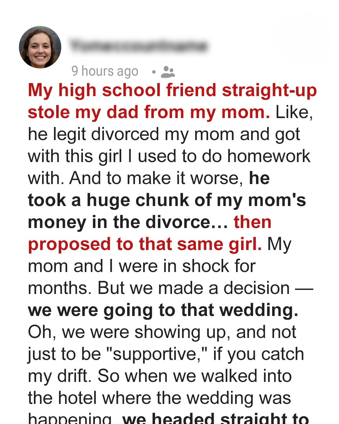 My high school friend straight-up stole my dad from my mom. It sounds like a bad Lifetime movie, doesn’t it? But this was my life. He legit divorced my mom and got with this girl I used to do homework with, shared secrets with, had sleepovers with. I mean, we weren’t inseparable, but she was there. At family dinners. In our living room. Laughing with my mom. She was practically family already. Or so I thought. The first few weeks after my dad announced he was leaving were a blur of tears and shouting. Mom was a wreck. I was a wreck. We clung to each other, trying to make sense of the seismic shift that had just torn our lives apart. Then came the bombshell: he was seeing someone. Someone he’d apparently been seeing for months. My dad, the man who preached loyalty and family values, had been living a double life. And when we finally found out who it was… I felt sick. Not just sick, but violated. It was her. The quiet one. The sweet one. The one who brought me cookies when I was studying for finals.