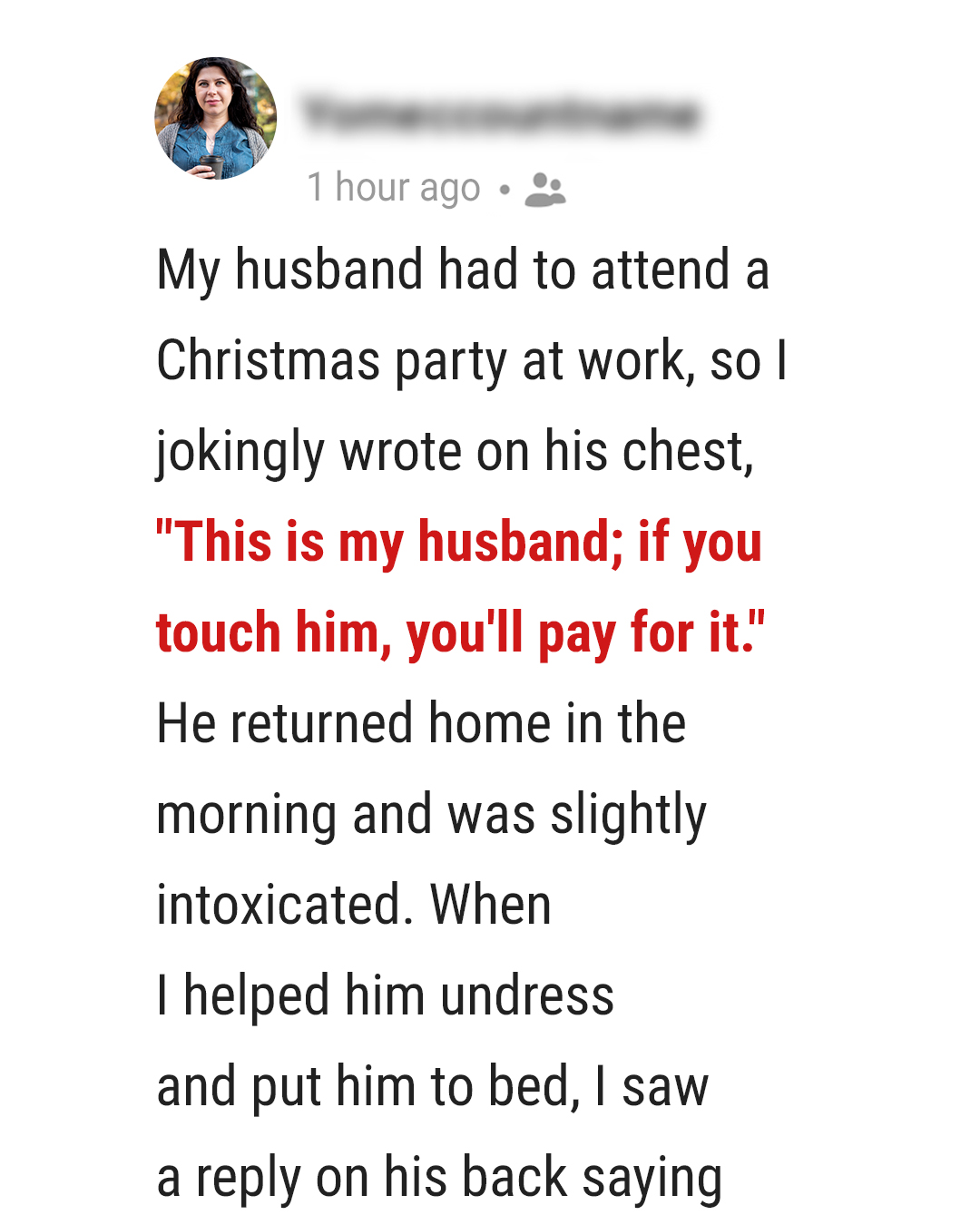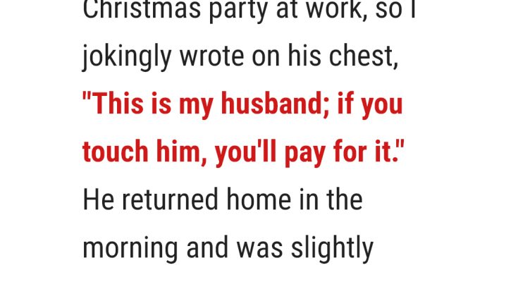 It was the kind of cold, crisp December night that always made me feel hopeful. Christmas lights twinkled outside our window, reflecting in the warm glow of our living room. My husband was getting ready for his annual work Christmas party, and I was in one of those ridiculously playful moods. He was grumbling good-naturedly about having to go, insisting he’d rather stay home with me, but I knew he secretly enjoyed the free food and the chance to see his colleagues outside of spreadsheets. As he buttoned his shirt, I grabbed a permanent marker from the kitchen drawer. A little joke, just between us, I thought, a giggle bubbling up. He raised an eyebrow, a knowing smile playing on his lips, as I pulled his shirt aside. With a flourish, I wrote carefully across his chest, just above his heart: “This is my husband; if you touch him, you’ll pay for it.” He laughed, a deep, rumbling sound that always melted my insides. He kissed my forehead, ruffled my hair, and promised he’d be home as soon as he decently could. My sweet, loyal man.