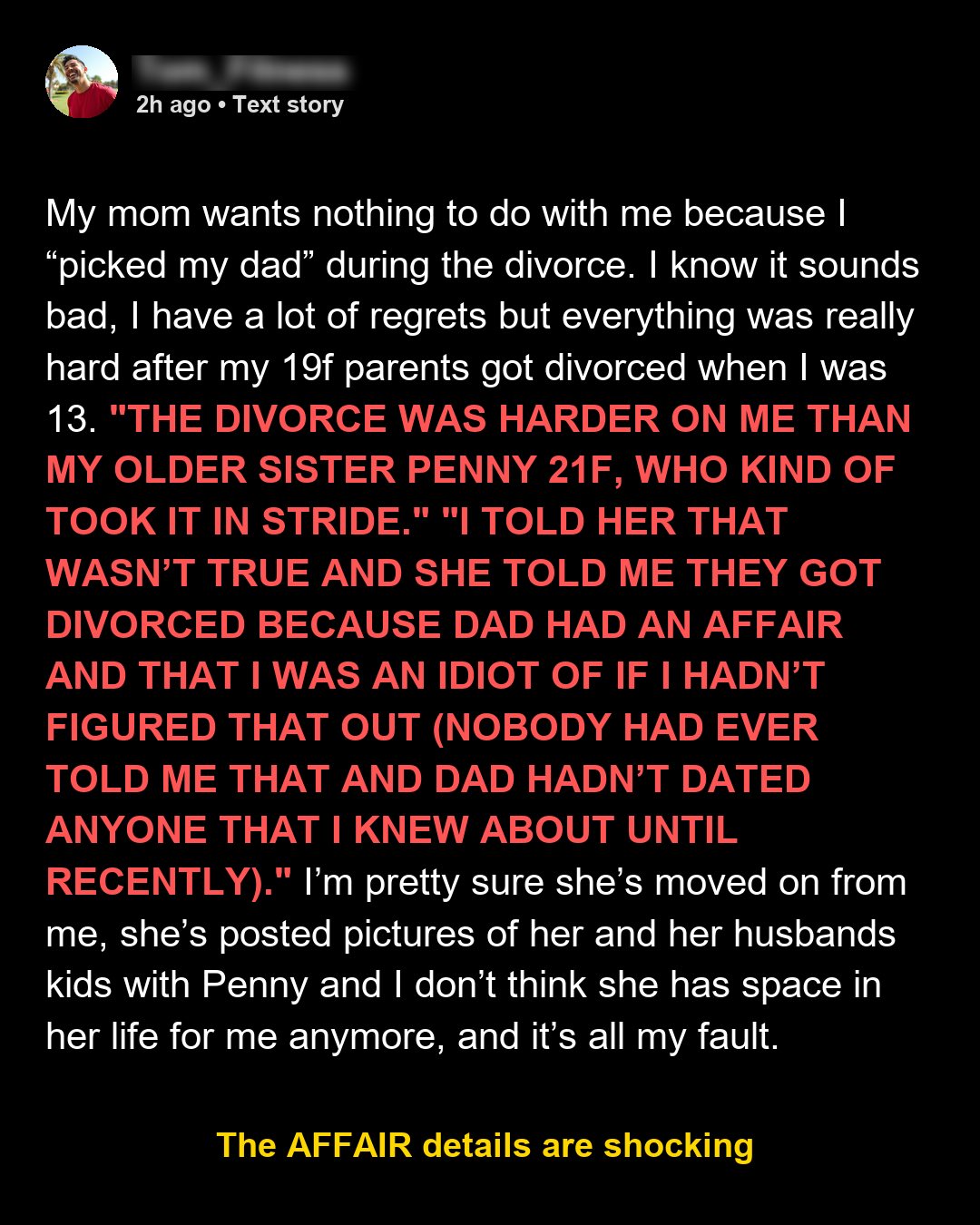 My mom wants nothing to do with me because I “picked my dad” during the divorce. I know it sounds bad, I have a lot of regrets but everything was really hard after my 19f parents got divorced when I was 13. I had a happy childhood before then, and was closest with my mom. The divorce was harder on me than my older sister penny 21f, who kind of took it in stride. My mom moved out and into an apartment, and was just generally incredibly depressed. She drank a lot and it was just a mess. We were 50/50, but the schedule they came up with was annoying because I’d have to switch houses like every 2-3 days and I went to a private school so I had uniforms and I was always getting in trouble for leaving them at the other house or not having things. Then mom moved 45 minutes away from my school. They gave my sister a car so that she would drive me to school but I played sports and she didn’t and she didn’t want to hang around for me after school. So I was always waiting around and would sometimes just end up at my dads anyways. So I asked if I could stay with dad on weekdays and mom on weekends. My dad didn’t want to only have me for school days so I was with him one weekend and her the other three. I thought it was awesome but I could tell my mom seemed less, idk? Fond of me.