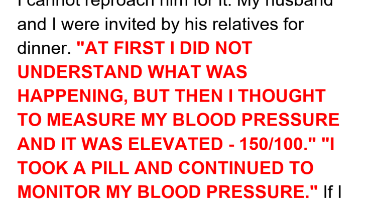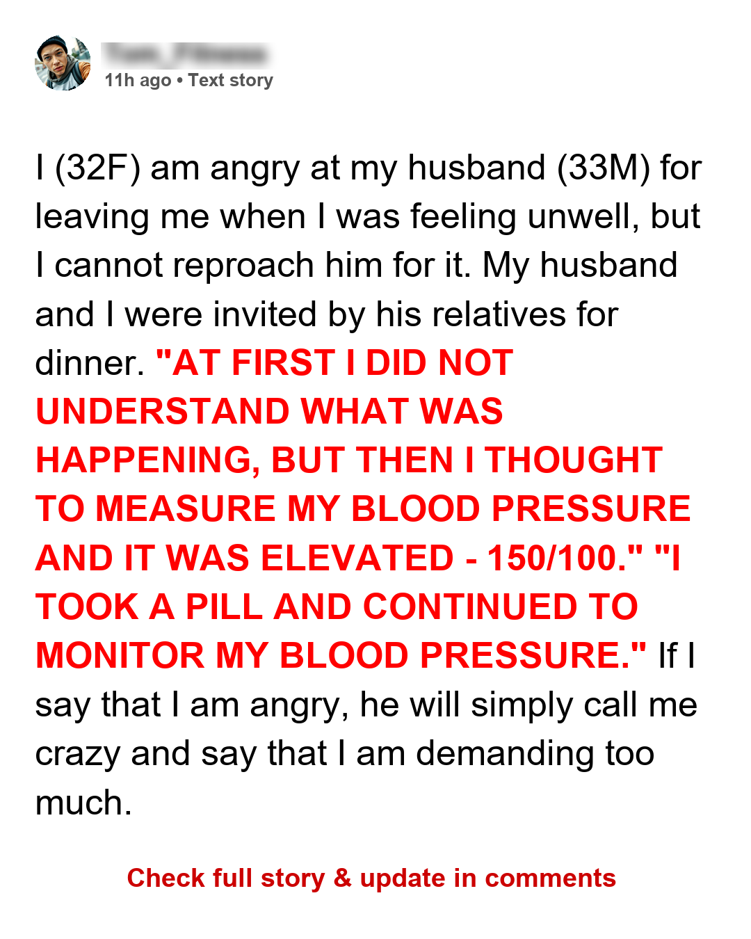 I (32F) am angry at my husband (33M) for leaving me when I was feeling unwell, but I cannot reproach him for it. My husband and I were invited by his relatives for dinner. That whole day I had a headache, dizziness, and because of that my coordination was impaired. At first I did not understand what was happening, but then I thought to measure my blood pressure and it was elevated – 150/100. This had never happened to me before and I genuinely felt terrible. I took a pill and continued to monitor my blood pressure. By the time we had to go to his relatives, the pressure went down a bit, but it was still not normal – 140/90. I warned my husband that most likely I would not be able to stay there for long and that I would go home earlier.
