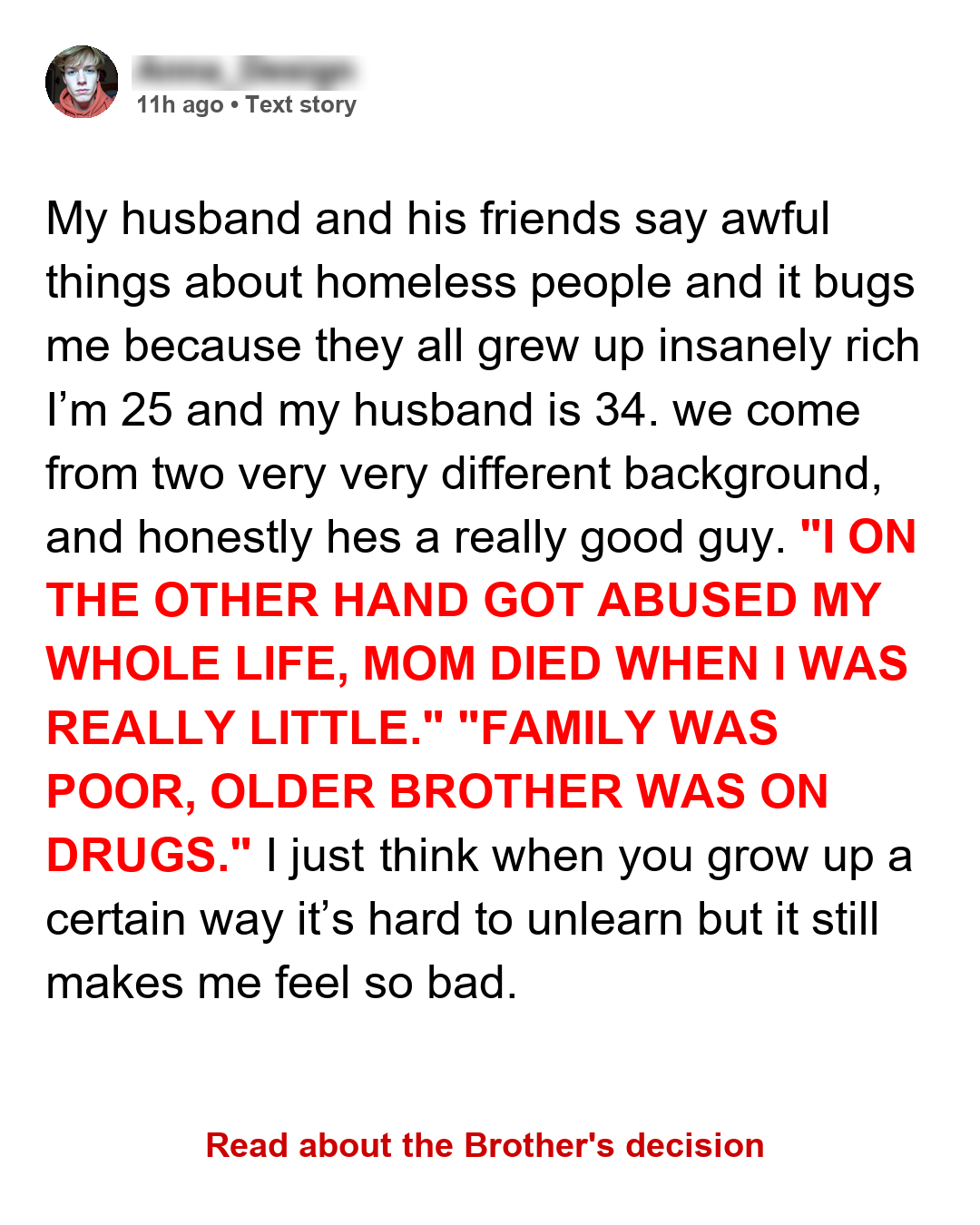 My husband and his friends say awful things about homeless people and it bugs me because they all grew up insanely rich I’m 25 and my husband is 34. we come from two very very different background, and honestly hes a really good guy. everyone in his “circle” is exactly the same. he grew up insanely rich, private school, university all paid for and to top it off his family owns a huge company that he took over 3 years ago. everyone around him is pretty similar, he is a hard worker and im not at all saying it in a negative way, but it’s just true. i on the other hand got abused my whole life, mom died when I was really little. family was poor, older brother was on drugs. lived in my car, failed out of college because in high school I was in survival mode and learned nothing. by the time I met him I was planning to end my life. I had absolutely no plans for the future, 10k of debt and was living in my car and air bnbs.