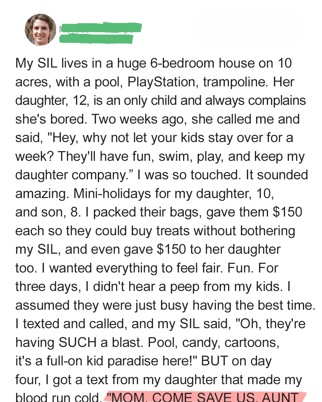 My sister-in-law, let’s call her Brenda, lives what most would consider an **idyllic life**. She resides in a sprawling six-bedroom house situated on ten acres of land, complete with a shimmering pool, a state-of-the-art PlayStation setup, and even a trampoline. Her daughter, Maya, is twelve years old and an only child. Despite the apparent abundance of entertainment, Maya frequently complains of boredom. Two weeks ago, Brenda extended an invitation that seemed too good to be true. She called me, bubbling with enthusiasm, and said, “Hey, why not let your kids stay over for a week? They’ll have fun, swim, play, and keep Maya company.” I was genuinely touched by the offer. It sounded like the perfect solution – a mini-holiday for my daughter, ten-year-old Lily, and my son, eight-year-old Tom. I eagerly packed their bags, adding sunscreen, swimsuits, and their favorite toys. To ensure they could indulge in treats without constantly bothering Brenda, I gave each of them $150. I even included an extra $150 for Maya, wanting everything to feel fair and balanced. I envisioned a week filled with fun, laughter, and unforgettable memories. For the first three days, I didn’t hear a peep from my kids. I optimistically assumed they were just too busy having the time of their lives to reach out. Whenever I texted or called Brenda, she would reassure me, saying, “Oh, they’re having SUCH a blast. Pool, candy, cartoons – it’s a full-on kid paradise here!” I felt a wave of relief wash over me, thinking I’d made the right decision.