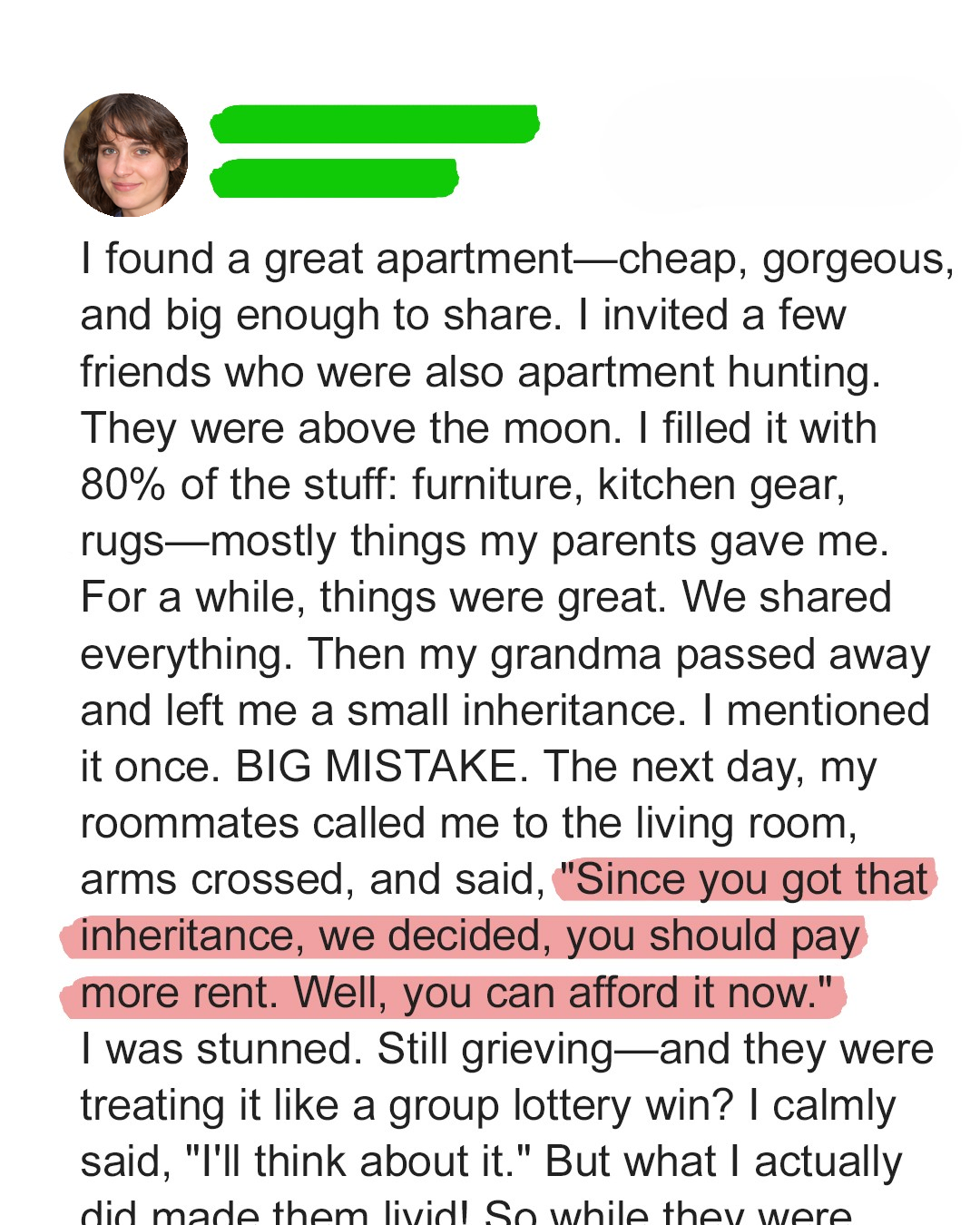 The very next day, I was summoned to the living room by my roommates. I could sense an unsettling tension in the air as I entered the room. They stood there, arms crossed and faces stern, as if preparing for a serious confrontation. With a chillingly matter-of-fact tone, they informed me that they had come to a collective decision. [ “Since I had received the inheritance, they had decided that I should be responsible for paying a larger share of the rent.” ] Their reasoning, as they coldly explained, was that I could now “afford it.” The audacity of their demand left me completely speechless and utterly stunned. I was still reeling from the recent loss of my grandmother, and their callous attitude felt like a slap in the face.