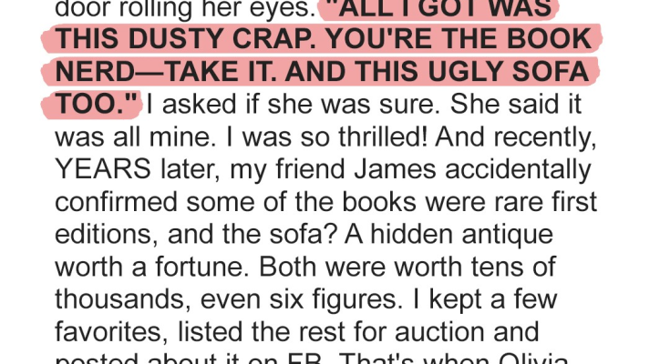 I decided to keep a few of my favorite books for sentimental reasons and listed the rest for auction. I also contacted an antique dealer about the sofa, who was eager to acquire it. Excited about my unexpected windfall, I posted about it on Facebook, sharing my story of how I came to own these treasures. That’s when Olivia called. And that’s when the trouble REALLY began. She was LIVID, screaming into the phone. “YOU’RE SELLING MY INHERITANCE?!” she shrieked. “I just… just didn’t have space! You were supposed to hold it!”