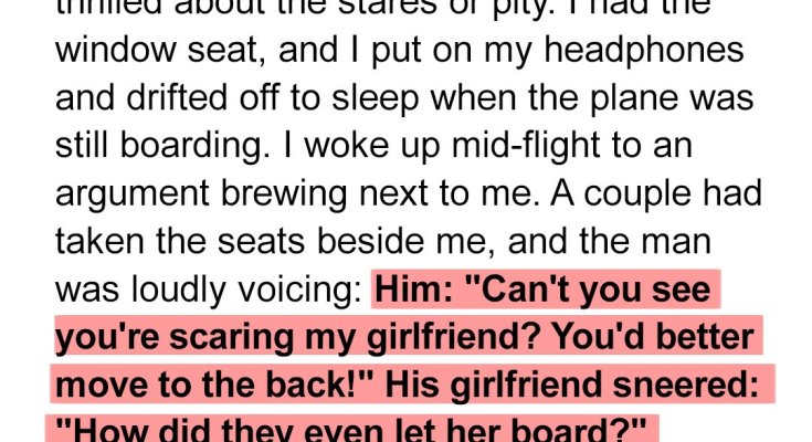 I recently sustained serious facial injuries, leaving me with visible scars that were still in the process of healing. The whole ordeal had been incredibly traumatic, both physically and emotionally, and I was still struggling to come to terms with my new appearance. Flying home for a family event was not something I was particularly thrilled about. I was already anticipating the stares, the whispers, and the uncomfortable pitying glances. The thought of facing my extended family, many of whom hadn’t seen me since the accident, filled me with anxiety. I just wanted to get home, get the event over with, and retreat back to my safe little bubble. I had booked a window seat, hoping to avoid as much interaction as possible. As soon as I settled in, I put on my headphones, cranked up the music, and closed my eyes, hoping to drift off to sleep before the plane even took off. I managed to doze off while the plane was still boarding. The gentle hum of the engines and the muffled sounds of people settling in around me lulled me into a light sleep. However, my peaceful slumber was abruptly shattered when I woke up mid-flight to the sound of a loud and heated argument brewing right next to me. I groggily opened my eyes and saw a couple had taken the seats beside me. The man was leaning over, his face red with anger, and he was loudly and aggressively voicing his complaints. His words were like daggers, each one laced with venom and dripping with disdain.