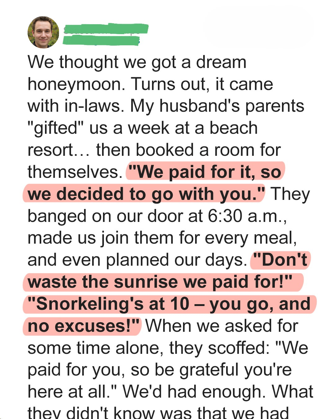 Upon arrival, we were greeted not only by the friendly resort staff but also by my in-laws, who were standing in the lobby with smug grins plastered across their faces. They casually informed us that they had booked a room for themselves at the same resort. Their reasoning? “We paid for it, so we decided to come along and make sure you’re making the most of it!” **My jaw dropped**. My husband and I exchanged bewildered glances, realizing that our dream honeymoon was about to morph into something akin to a family vacation from hell. The first morning set the tone for the rest of the week. At precisely 6:30 AM, a thunderous pounding on our door jolted us awake.