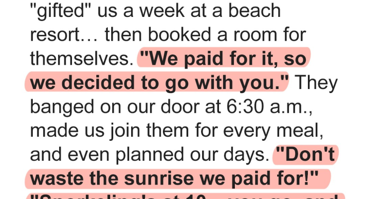We envisioned a serene honeymoon, a blissful escape to a sun-kissed beach resort where we could bask in the afterglow of our wedding. Picture this: crystal-clear turquoise waters, powdery white sand between our toes, and the gentle caress of a tropical breeze as we sipped cocktails under the shade of swaying palm trees. It was supposed to be our sanctuary, a chance to connect on a deeper level and create memories that would last a lifetime. We spent weeks meticulously planning every detail, poring over travel brochures and online reviews, dreaming of romantic dinners, sunset strolls, and intimate moments shared in our own private paradise. Little did we know that our idyllic vision was about to be shattered by the unwelcome intrusion of my husband’s parents. The initial gesture seemed incredibly generous. My in-laws, with beaming smiles and an air of self-satisfaction, announced that they wanted to “gift” us a week-long stay at a luxurious beach resort. Overwhelmed with gratitude, we accepted their thoughtful present, picturing ourselves luxuriating in the lap of opulence, completely oblivious to the impending storm clouds gathering on the horizon. The resort was indeed magnificent, boasting breathtaking views, world-class amenities, and impeccable service. However, our appreciation quickly turned to dismay when we discovered the true extent of their “generosity.”