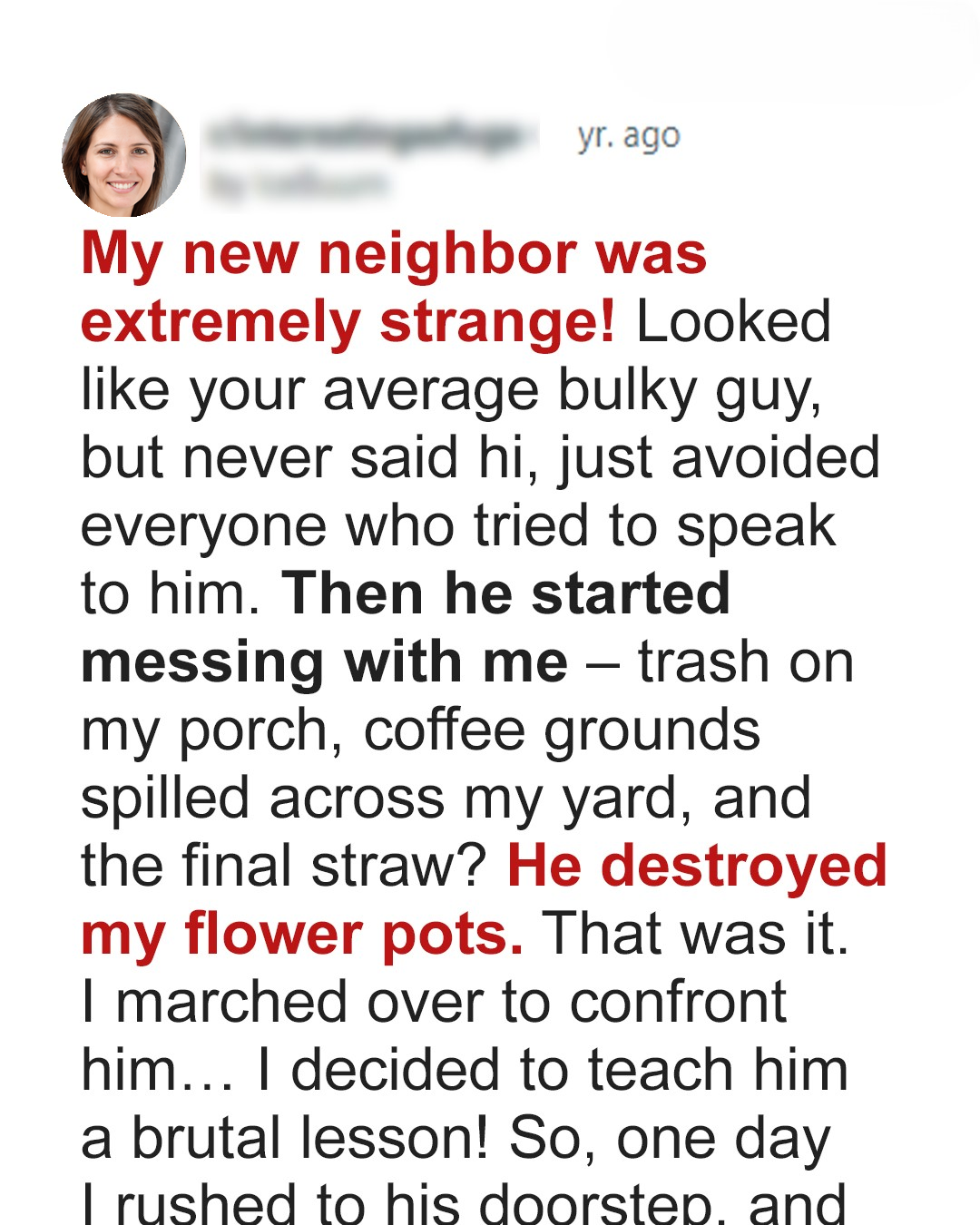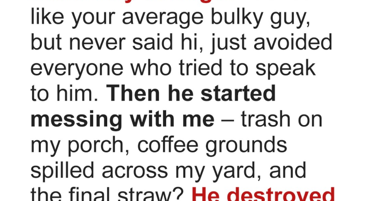 “Can I help you, dear?” she asked, her voice trembling slightly. Confused, I stammered, “I… I’m looking for the man who lives here… the big guy?” The woman chuckled softly. “Oh, you must mean my grandson, he doesn’t live here anymore, he moved to Alaska last week and left me here. [“I have been so lonely, waiting for someone to say hello.” ]” I realized with horror that I had been preparing to unleash my fury on the wrong person. My neighbor was gone, replaced by his sweet grandmother. All this for nothing.