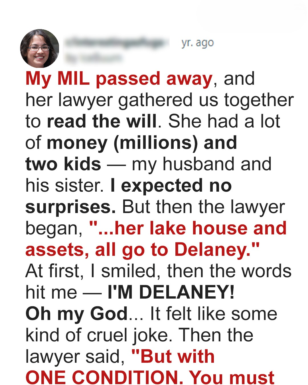 “…her lake house and assets, all go to Delaney.” At first, a wave of warmth washed over me. I smiled, genuinely happy for my sister-in-law. She had always admired the lake house, a beautiful retreat nestled on the shores of a serene lake, and I knew how much it would mean to her. I pictured her spending her summers there, surrounded by family and friends, creating memories that would last a lifetime. It was a generous gift, a symbol of my mother-in-law’s love and appreciation for her daughter. But then, the words began to sink in, slowly and agonizingly, like a lead weight in my stomach. The lawyer continued, his voice unwavering, “…her lake house and assets, all go to Delaney.” And then it hit me, with the force of a physical blow. [**I’M DELANEY!**] My mind reeled, my thoughts racing in a chaotic jumble of confusion and disbelief. Was this some kind of cruel joke? A bizarre misunderstanding? Or was this actually happening?