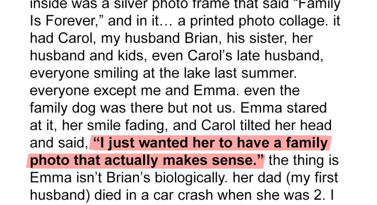 Last weekend was my daughter Emma’s 9th birthday, and we had a lovely party for her. After cake and games, it was present time, which she was so excited about. She started opening her gifts, and her face lit up as she picked up a beautifully wrapped present from my mother-in-law, Carol. “It’s from grandma!” she exclaimed, smiling from ear to ear, and I swear I caught Carol smirking ever-so-slightly, a detail that immediately set off alarm bells in my head. I couldn’t shake the feeling that something was off, but I brushed it aside, hoping I was just being paranoid. Little did I know, the seemingly innocent gift was about to unleash a wave of emotion and reveal a deep-seated resentment I never fully understood. I braced myself, I thought that maybe I was reading too much into a simple present, but the feeling of unease only intensified as Emma eagerly ripped open the wrapping paper. Inside the box was a silver photo frame, and engraved on it were the words “Family Is Forever.” It seemed harmless enough, a sentimental gift from a grandmother to her granddaughter. But what came next shattered the illusion of familial harmony. Inside the frame was a printed photo collage, and as Emma pulled it out, the color drained from her face. The collage depicted Carol, my husband Brian, his sister, her husband and their kids, even Carol’s late husband – everyone smiling and seemingly enjoying themselves at the lake last summer. It was a snapshot of a family gathering, a moment of shared joy and connection. Except… there were two very important people missing.
