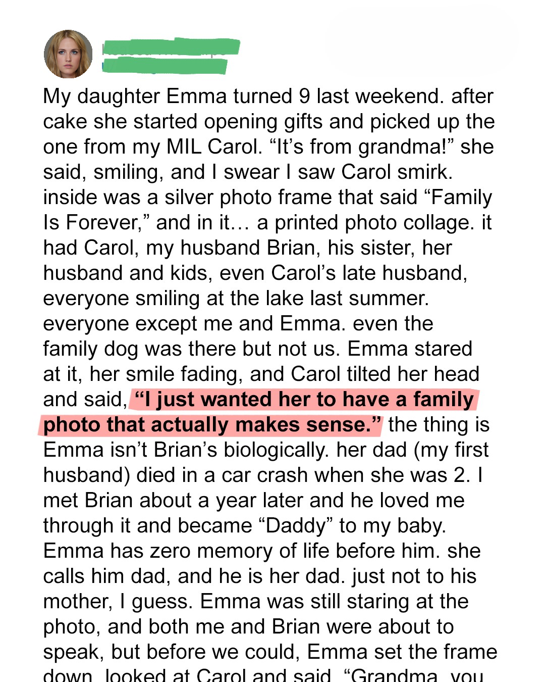 Last weekend was my daughter Emma’s 9th birthday, and we had a lovely party for her. After cake and games, it was present time, which she was so excited about. She started opening her gifts, and her face lit up as she picked up a beautifully wrapped present from my mother-in-law, Carol. “It’s from grandma!” she exclaimed, smiling from ear to ear, and I swear I caught Carol smirking ever-so-slightly, a detail that immediately set off alarm bells in my head. I couldn’t shake the feeling that something was off, but I brushed it aside, hoping I was just being paranoid. Little did I know, the seemingly innocent gift was about to unleash a wave of emotion and reveal a deep-seated resentment I never fully understood. I braced myself, I thought that maybe I was reading too much into a simple present, but the feeling of unease only intensified as Emma eagerly ripped open the wrapping paper. Inside the box was a silver photo frame, and engraved on it were the words “Family Is Forever.” It seemed harmless enough, a sentimental gift from a grandmother to her granddaughter. But what came next shattered the illusion of familial harmony. Inside the frame was a printed photo collage, and as Emma pulled it out, the color drained from her face. The collage depicted Carol, my husband Brian, his sister, her husband and their kids, even Carol’s late husband – everyone smiling and seemingly enjoying themselves at the lake last summer. It was a snapshot of a family gathering, a moment of shared joy and connection. Except… there were two very important people missing.