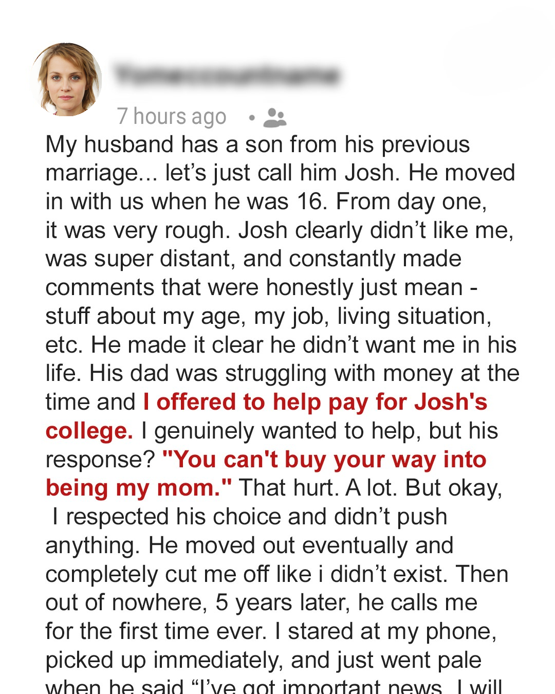 My husband has a son from his previous marriage, let’s call him Josh. He moved in with us when he was 16. From day one, it was a struggle. Josh clearly didn’t like me, was super distant, and constantly made comments that were honestly just mean – stuff about my age, my job, our living situation, everything seemed to be up for debate. He made it crystal clear that he didn’t want me in his life, and honestly, it felt like I was constantly walking on eggshells around him, trying to avoid setting him off. It was like I was permanently relegated to the role of unwanted intruder in his world, a constant reminder of a life he didn’t choose. I tried to be understanding, thinking it was just teenage angst and adjusting to a new family dynamic, but his hostility seemed to deepen with each passing day. His dad was struggling with money at the time, and I genuinely wanted to help, so I offered to pay for Josh’s college. It wasn’t about trying to replace his mom; it was about giving him the best possible future. However, his response was a punch to the gut. He looked me dead in the eye and said, “You can’t buy your way into being my mom.” That hurt. A lot. It felt like every effort I made to connect with him was met with a brick wall. I wasn’t trying to erase his mother or steal his affections; I just wanted to ease the burden on his father and help Josh achieve his goals. But his words echoed in my mind, confirming my fears that I would never truly be accepted.