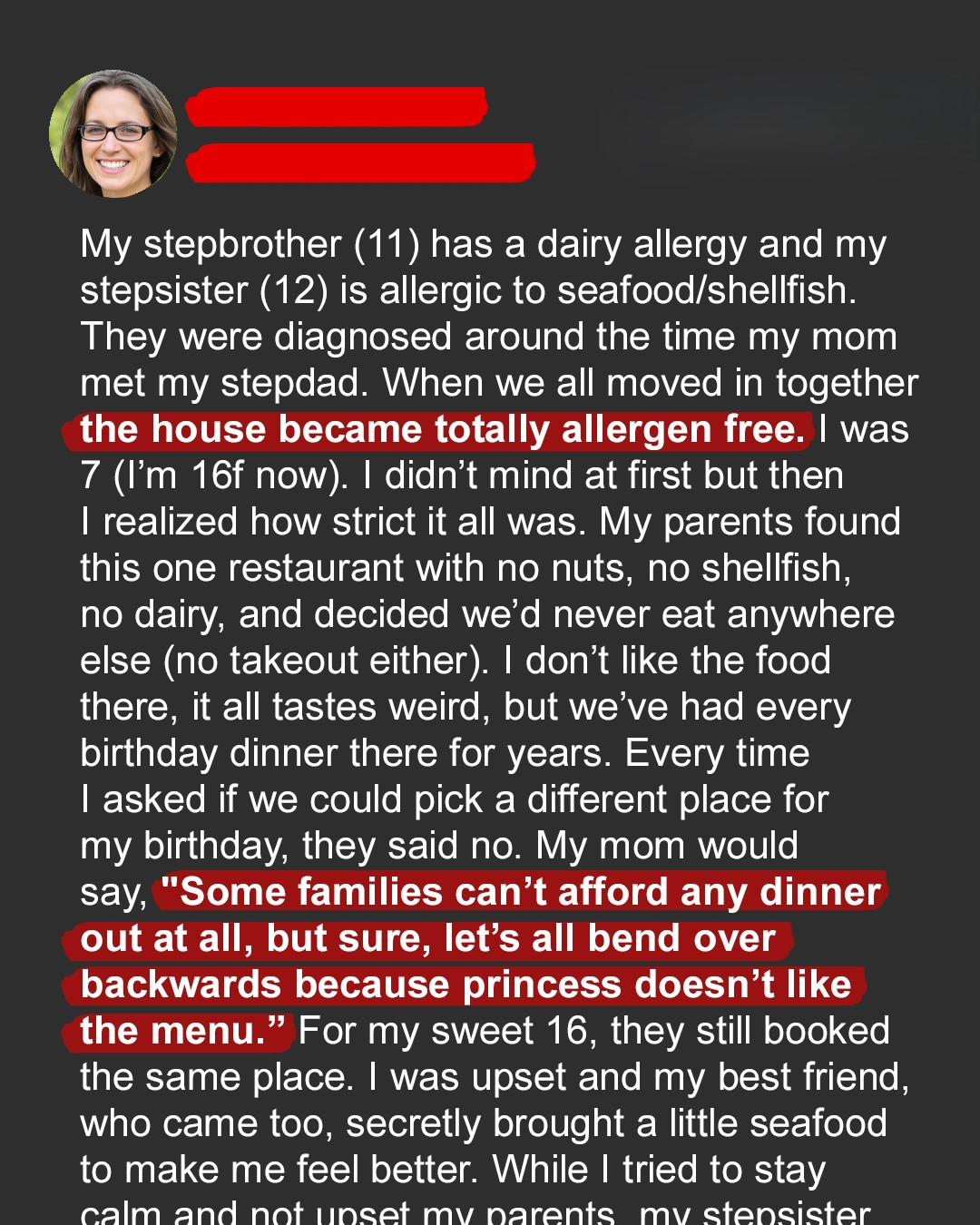 The realization of what had happened hit me like a ton of bricks. The seafood I had secretly consumed had somehow contaminated her food, triggering a life-threatening reaction. The guilt and horror I felt were overwhelming. My sweet 16 had turned into a nightmare, and I was the cause. I don’t know what to do. Now the whole family hates me. I understand what I did was wrong, but it wasn’t all my fault, right?