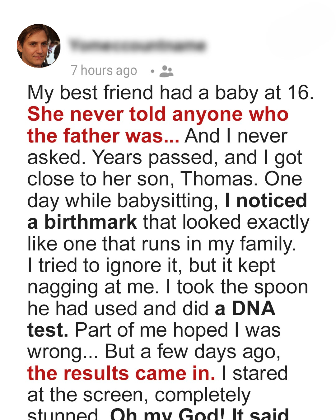 A few days ago, the results came in. I stared at the screen, completely stunned. My hands trembled as I read the words, trying to make sense of what I was seeing. My vision blurred and my head was spinning. Oh my God! The screen read, “[ ‘Thomas is your son!’ ]”.