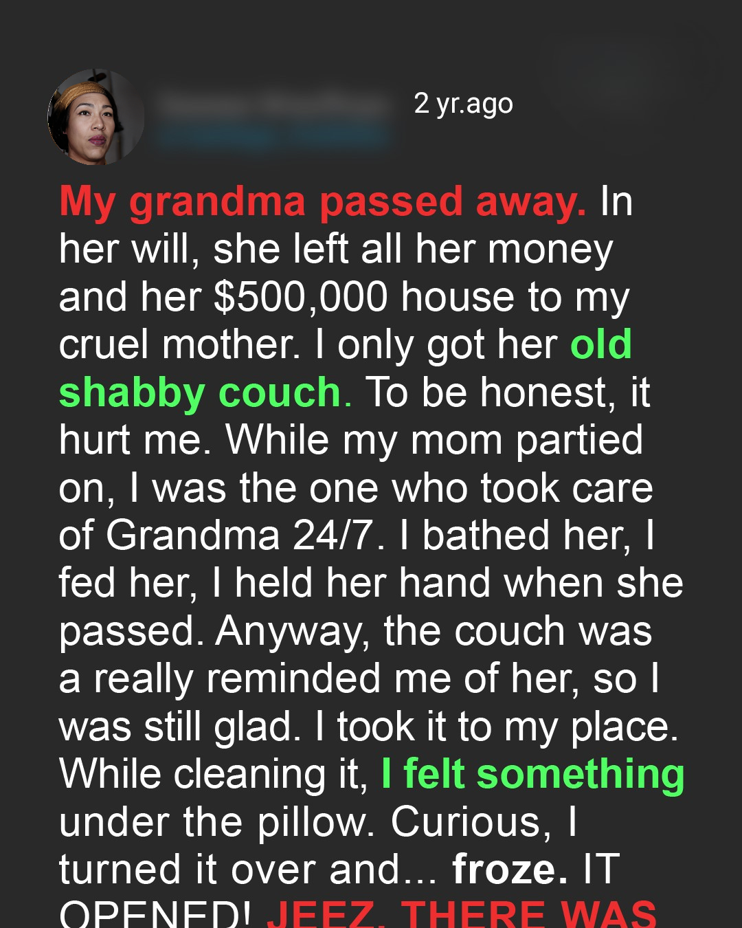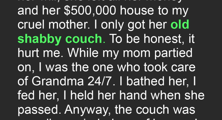My grandmother’s passing was a difficult time for our family. She had been ill for quite some time, and while we knew it was coming, it didn’t make the loss any easier. What made it infinitely worse, however, was the reading of the will. My mother, bless her heart, isβ¦ complicated. She and my grandmother had a very close, albeit turbulent, relationship. I, on the other hand, had always felt like I was on the periphery. Still, I loved my grandmother dearly, and in her final years, I was the one who took care of her. I bathed her, fed her, read to her, and held her hand as she drifted off to sleep. I was there, completely devoted. My mother would visit occasionally, but she was always rushing off to some party or event. She was never really **present**. So, imagine my surprise when the will was read, and it turned out that my mother was the sole beneficiary of my grandmother’s estate. All the money, the house, everything went to her. And me? I received my grandmother’s old, worn-out couch. To say I was hurt would be an understatement. I felt completely overlooked and undervalued. It felt like all the time and effort I poured into caring for my grandmother meant absolutely nothing. My mother, of course, was ecstatic. She immediately started making plans to renovate the house and throw lavish parties. It was like my grandmother’s death was just an excuse for her to celebrate. I tried to be happy for her, but it was difficult.