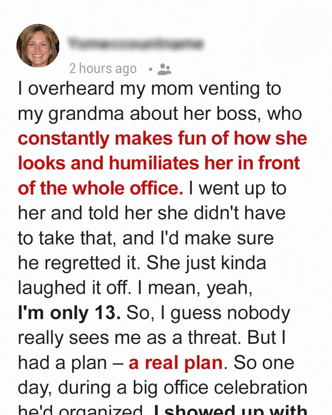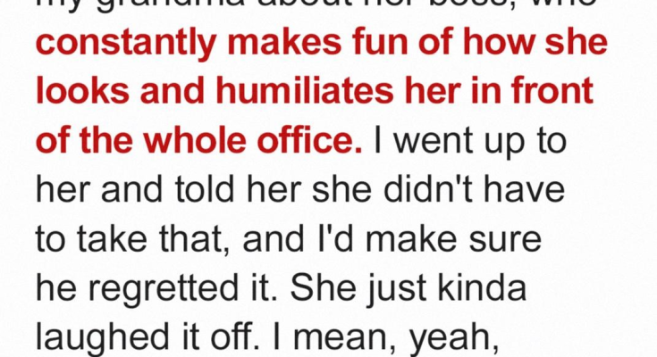 It’s hard to describe the feeling of helplessness that washed over me as I stood outside the slightly ajar door, eavesdropping on my mom’s hushed, tearful conversation with my grandma. I could hear the tremor in her voice as she recounted the **daily torment** she endured at the hands of her boss. Apparently, this man, this supposed professional, took great pleasure in tearing her down, making snide remarks about her appearance, and generally creating a hostile and humiliating work environment. The details were sickening – how he’d openly mock her clothing choices, make belittling comments about her weight, and even mimic her mannerisms in front of the entire office. The sheer audacity of his behavior left me reeling. I’ve always seen my mom as this strong, capable woman, a pillar of our family. To hear her so broken, so vulnerable, was almost unbearable. It felt like a direct attack on everything I held dear. I couldn’t just stand by and watch her suffer in silence. Something inside me snapped, a fierce protectiveness ignited. I knew I had to do something, anything, to stop this man and restore my mom’s dignity. I felt the fire of righteous indignation. [ “HE MESSED WITH THE WRONG FAMILY” ].
