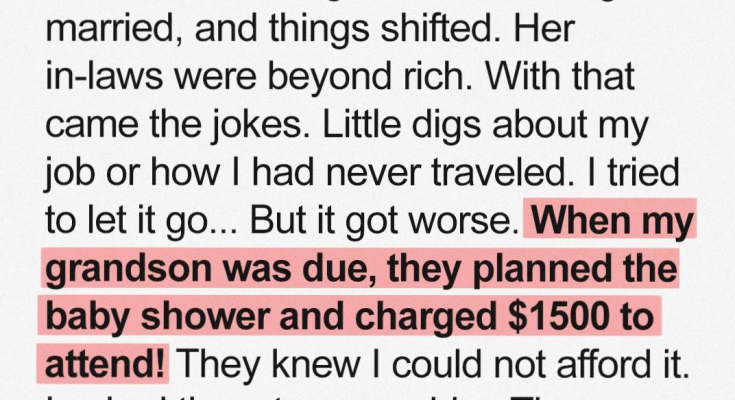 Then came the announcement of my grandson. I was over the moon with joy, eagerly anticipating the arrival of this new life. I couldn’t wait to hold him in my arms, to shower him with the same unconditional love I had given my daughter. But my excitement quickly turned to dread when I learned about the baby shower. The in-laws, of course, were planning it. It was to be held at an exclusive venue, catered by a celebrity chef, and decked out with extravagant decorations. The invitation, printed on thick, expensive paper, arrived in the mail, and my heart sank as I read the fine print: “Contribution fee: $1500 per person.” I nearly choked. Fifteen hundred dollars! That was more than my monthly rent. They knew perfectly well that I couldn’t afford it. They knew I lived paycheck to paycheck, working tirelessly to make ends meet. This wasn’t just a baby shower; it was a blatant display of their wealth and a deliberate attempt to exclude me.