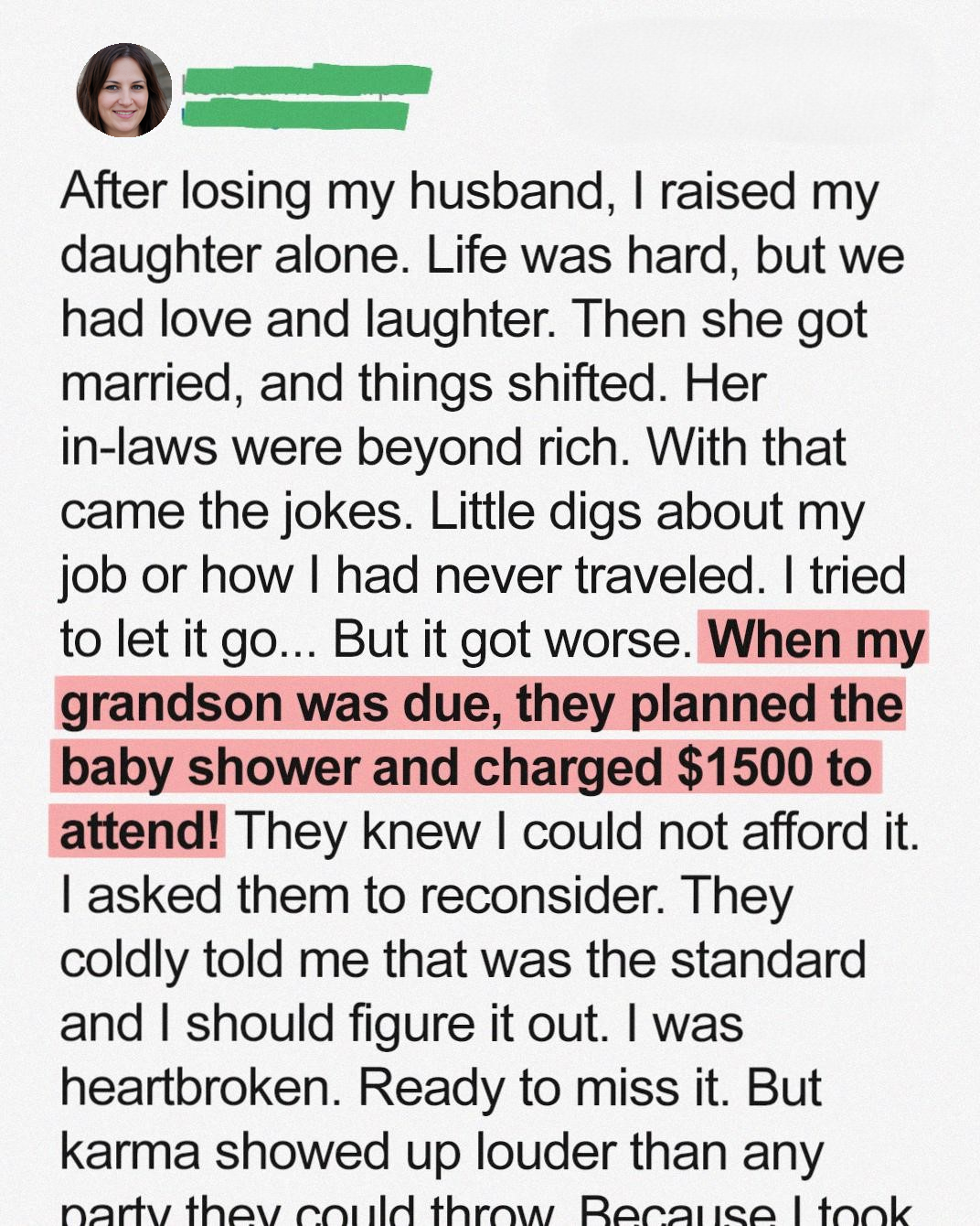 I was defeated. The thought of missing my grandson’s baby shower was painful, but I didn’t see any other option. I moped around my small apartment, the invitation mocking me from the coffee table. I felt a deep sense of injustice, of being excluded because of my financial status. I began to wonder if this was how things would always be, if I would forever be relegated to the fringes of my daughter’s new life. Then, a phone call changed everything. It was from a lawyer’s office. A distant relative, whom I barely knew, had passed away and left me a significant inheritance. [ “Significant” ] doesn’t even cover it – It was *life-changing*.