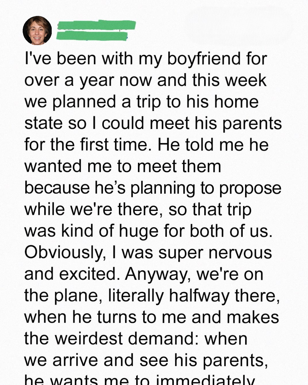 I’ve been with my boyfriend, Mark, for over a year now, and things have been pretty great. We laugh, we support each other, and we generally enjoy spending time together. This week, however, things took a turn for the unbelievably bizarre. Mark planned a trip to his home state so I could finally meet his parents. He’d been dropping hints for weeks that this trip was more than just a casual visit. He told me he wanted me to meet them because he’s planning to propose while we’re there, so naturally, this trip was kind of huge for both of us. Obviously, I was super nervous and incredibly excited. I spent hours agonizing over what to wear, what to say, and how to make a good impression. I even practiced my ‘surprised and delighted’ face in the mirror, just in case the proposal actually happened. The thought of being engaged to Mark filled me with a warm, fuzzy feeling. Everything seemed perfect. Until it wasn’t. We were on the plane, literally halfway to our destination, somewhere over the Midwest, when Mark turned to me and dropped a bombshell so shocking it completely shattered my reality. It wasn’t a casual request or a passing thought; it was a calculated, bizarre demand that left me speechless and reeling.