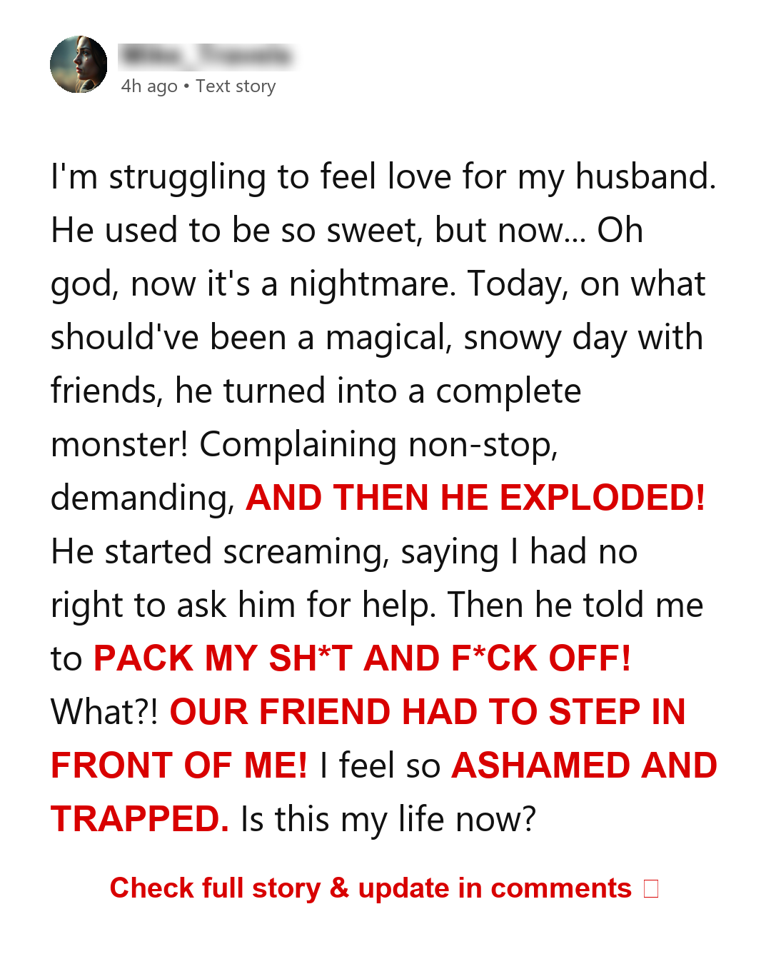 When I tried to push back, he told me that if I didn’t like something, I could pack my shit and fuck off out of his house. I asked him, “Yours?” (because it’s actually my apartment). That set him off even more. He started screaming that I was throwing it in his face that the apartment isn’t his, that he’s not an idiot, and that if it came to it, he’d make sure I was left with absolutely nothing. At one moment, our friend literally stepped in front of me with his body and told my husband to calm down. I feel so ashamed of this situation. This is how my husband behaves all the time. He constantly shifts responsibility and obligations onto others, and when that doesn’t work, he attacks me. I’m exhausted. I genuinely thought this was a good evening and that everyone was enjoying themselves, but he completely ruined it. The embarrassment of having our friends witness his behavior was almost unbearable. The image of our friend stepping in to protect me is seared into my memory, a stark reminder of the extent of his abuse. I’m left feeling humiliated, exhausted, and utterly heartbroken. I need to find a way out.