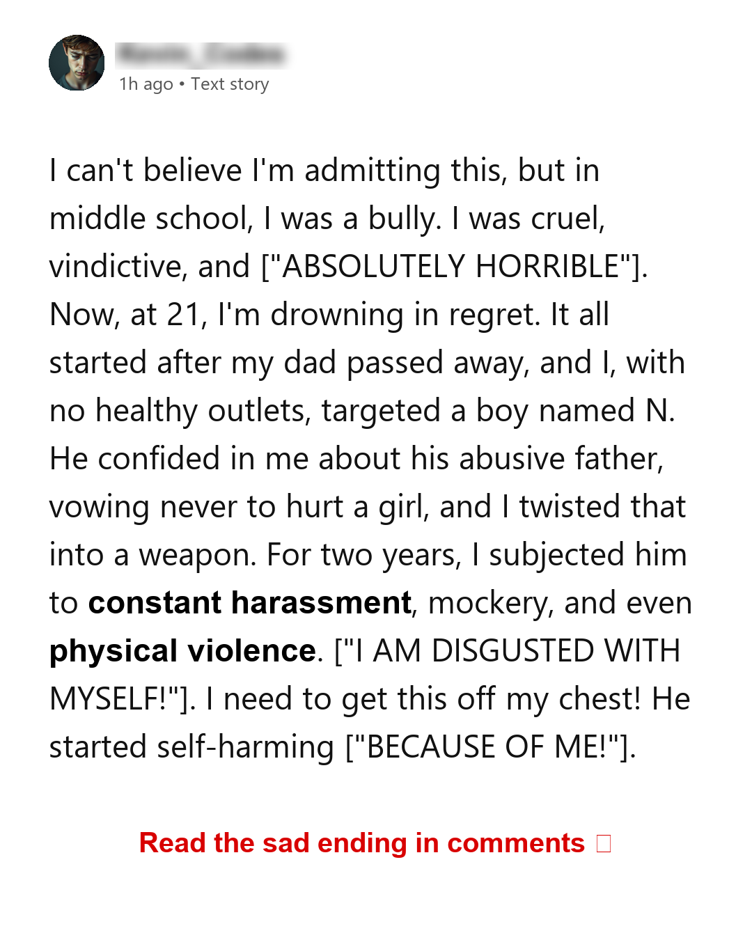 I need to confess something that has been eating me alive for years. I used to be a bully in middle school. I know, it’s awful. I’m now 21 years old, and the weight of what I did back then is almost unbearable. It’s not something I can easily brush off or forget, and honestly, I don’t think I deserve to. The guilt is a constant companion, a dark shadow that follows me everywhere I go. I replay the events in my head, cringing at my past self and desperately wishing I could take it all back. I understand that apologies can only go so far and that the damage is already done, but I still feel the need to express just how deeply sorry I am for the pain I inflicted. I’m not looking for forgiveness, nor do I believe I deserve it. I am merely hoping that by sharing my story, others might learn from my mistakes and avoid causing similar harm to those around them. It is so important to be mindful of our actions and to understand the lasting impact they can have on others. I’ve learned that lesson the hard way, and I will continue to carry this burden as a reminder of the person I once was and the person I strive to never be again. Maybe one day I will find a way to move past this, but until then, I can only hope that my confession serves as a warning to others: words and actions can have devastating consequences, and we must always strive to be kind and compassionate in our interactions with others.