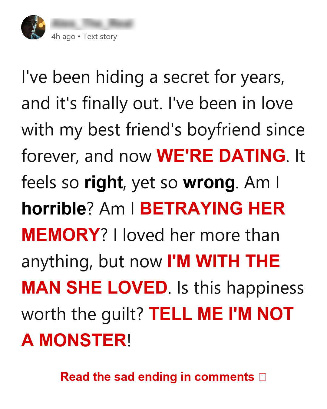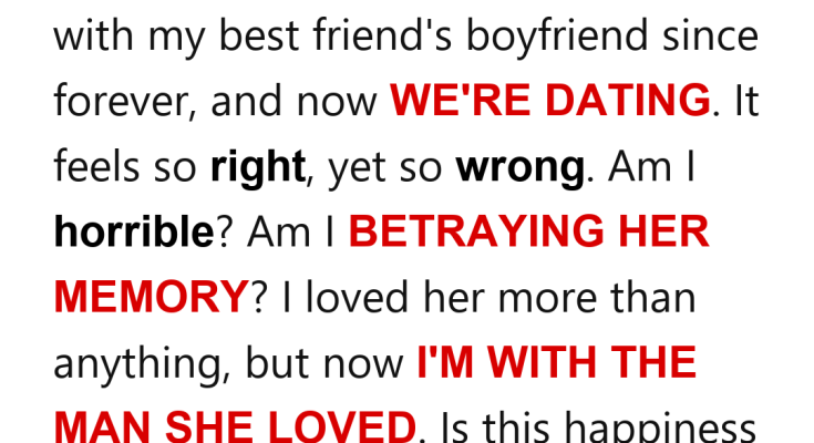 Now we’re dating and I’m so conflicted all the time. On one hand, I care about him a lot and being with him feels easy and right in a way I didn’t expect. On the other hand, I feel like I’m doing something wrong. Like I’m betraying her memory or breaking some unspoken rule. I keep asking myself if this is messed up. If I’m a terrible person for being happy with him. If my best friend would hate me for this, even though she’s gone. I loved her so much and I would have never, ever done this while she was alive.