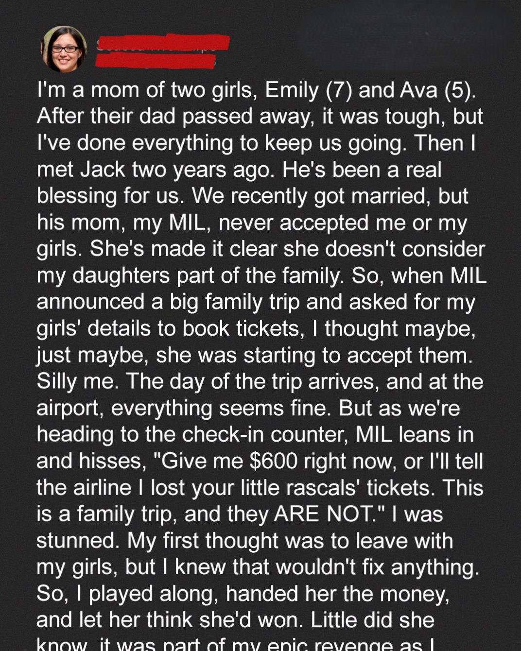 But as we were heading to the check-in counter, my mother-in-law leaned in close to me, her eyes narrowed, and hissed in a low, venomous voice, **”Give me $600 right now, or I’ll tell the airline I lost your little rascals’ tickets. This is a family trip, and they ARE NOT family.”** I was completely stunned. Her words hit me like a ton of bricks, shattering the fragile hope I had been harboring. It was as if she had ripped away the mask of civility she had been wearing and revealed her true, cruel self. My first instinct was to grab my girls and leave, to shield them from her toxicity and protect them from any further harm. But I knew that wouldn’t fix anything. I couldn’t let her win. I had to stand up to her, not just for myself, but for my daughters. I couldn’t let her get away with treating them like they didn’t belong. So, I took a deep breath and made a decision.