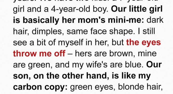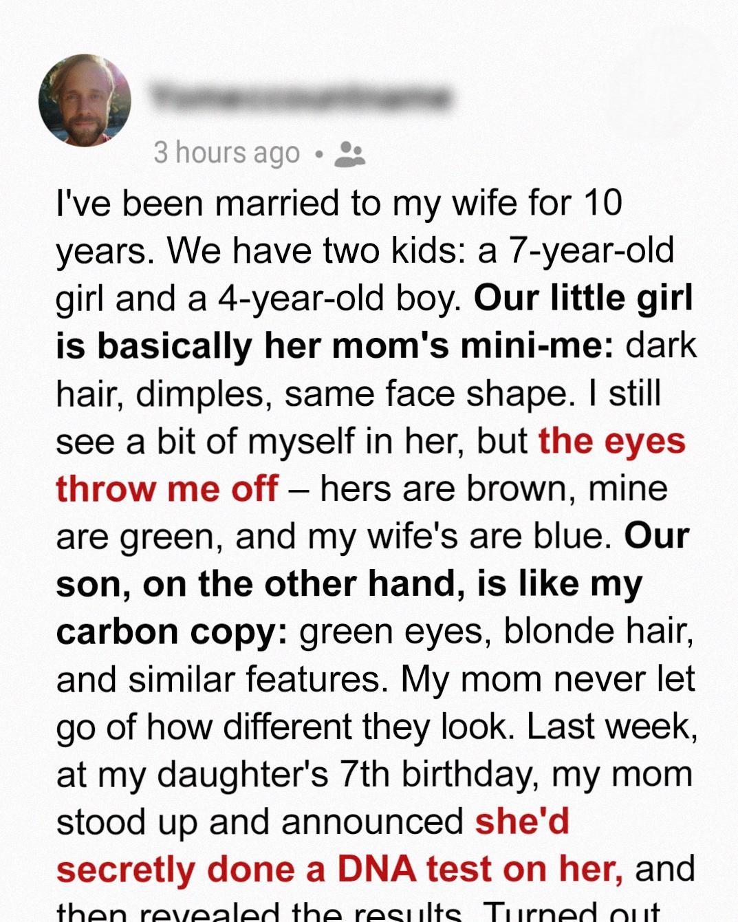I’ve been married to my wife, Sarah, for ten years. We have two wonderful children, a daughter, Emily, who is seven, and a son, Tom, who is four. Emily is, for all intents and purposes, Sarah’s mini-me. She has the same dark hair, the same adorable dimples when she smiles, and the same face shape. I can see a little bit of myself in her – perhaps in her mischievous grin – but her eyes always struck me as different. They are a warm, deep brown, while mine are a piercing green, and Sarah’s are a soft blue. Our son, Tom, on the other hand, is undeniably my carbon copy. He has my green eyes, my fair blonde hair, and, according to everyone who meets him, my similar features. My mother, bless her heart, has always been fixated on how different the two children look. She’d make little comments here and there, nothing overtly malicious, but enough to plant a seed of unease in my mind. I always brushed it off as her being…well, my mother. Overly involved and prone to dramatic pronouncements. I never imagined how far she would take her observations.