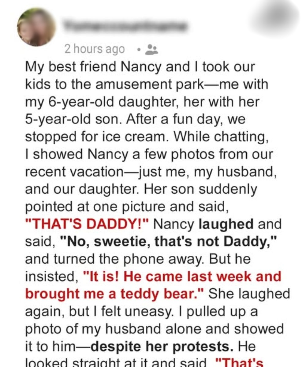I showed Nancy a few photos, commenting on how much Lily had loved building sandcastles and how my husband, Mark, had finally managed to relax and unwind from his stressful job. Everything seemed perfectly normal, until her son, Tommy, suddenly pointed at one of the pictures. The photo in question was a snapshot of Mark standing on the beach, smiling at the camera with the ocean in the background. I thought nothing of it, assuming Tommy was simply pointing out the pretty scenery or perhaps just admiring Mark’s sunglasses. But then, Tommy said something that made my blood run cold. He looked directly at the picture and exclaimed, “THAT’S DADDY!” Nancy and I both chuckled, thinking he was just being silly. “No, sweetie,” Nancy said gently, trying to steer the conversation away from the awkward moment. “That’s not Daddy. That’s Lily’s daddy.” She reached over and turned my phone away, clearly wanting to dismiss the comment as childish imagination. But Tommy was insistent. He squirmed in his seat, his little face flushed with determination. “It is!” he repeated, his voice rising slightly. “He came last week and brought me a teddy bear.” The casual laughter died in my throat. A cold wave of dread washed over me as I tried to make sense of what Tommy was saying. My mind raced, searching for any logical explanation, any way to dismiss his words as a child’s fantasy. But deep down, a nagging feeling of unease began to grow, a feeling that something was terribly wrong.