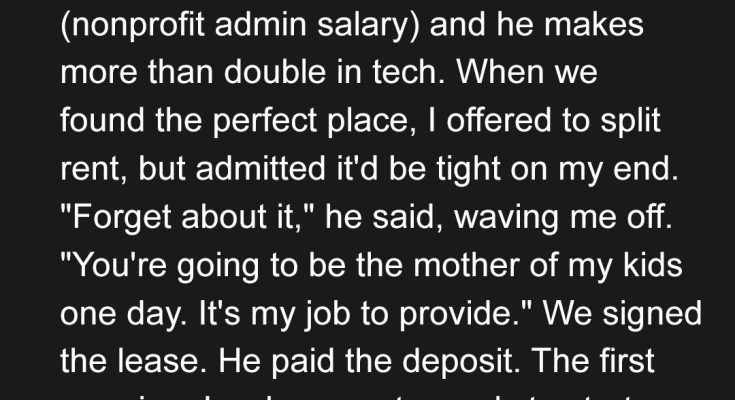 My boyfriend of two years, Matt, suggested we move in together. I was ecstatic. I don’t make much as a nonprofit administrator, and he makes more than double my salary in tech. When we found the perfect place, I offered to split the rent, but admitted it would be tight on my end. “Forget about it,” he said, waving me off. “You’re going to be the mother of my kids one day. It’s my job to provide.” I was swept off my feet. He was so generous, so loving, so seemingly perfect. I started imagining our future together: a cozy home filled with laughter, children running around, and a lifetime of happiness. We spent hours discussing paint colors, furniture arrangements, and even the names of our future pets. I truly believed I had found my soulmate, someone who understood and cherished me. The idea of waking up next to him every morning, sharing meals, and building a life together filled me with an overwhelming sense of joy and anticipation. This felt like the beginning of forever, a dream come true. I envisioned us growing old together, holding hands on the porch, reminiscing about all the adventures we had shared. The thought of spending my life with Matt filled me with a warmth and security I had never known before. It was as if all the pieces of my life were finally falling into place, creating a beautiful and complete picture. I was ready to embark on this new chapter, hand in hand with the man I loved, and create a lifetime of cherished memories.